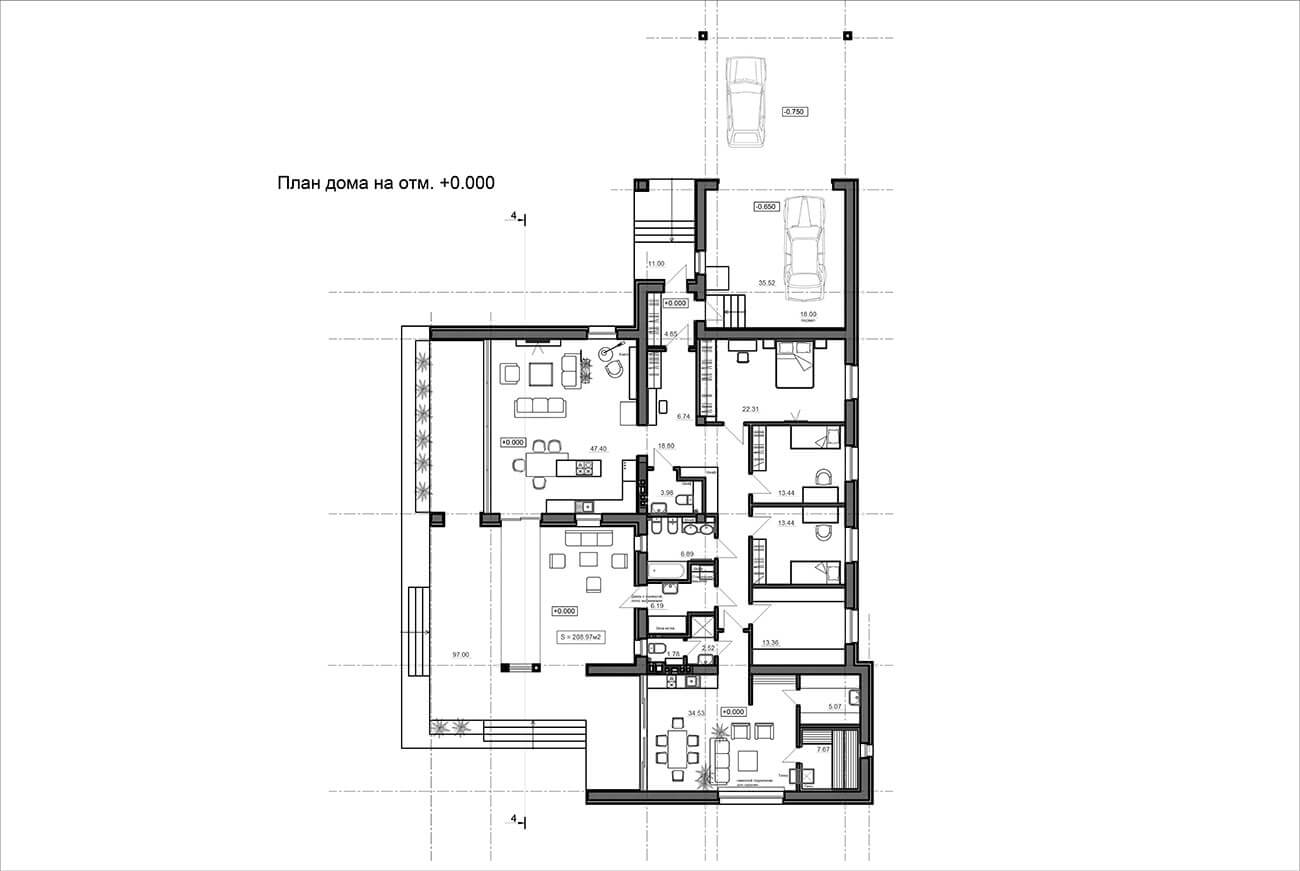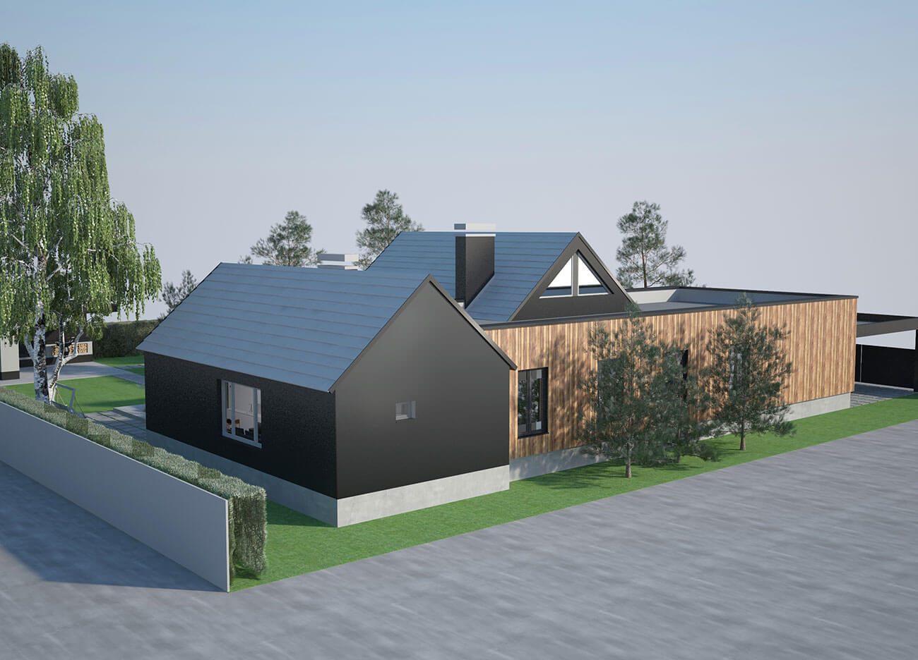 Усадьба для семьи (15 соток) находится среди сосновых деревьев в живописном месте Воронежской области. Главной задумкой проекта является создание двух современных треугольных объемов дома в стиле минимализм. Большой — кухня-гостиная. Малый — блок бани. Оба являются доминирующими элементами архитектуры дома. Акцентным объемом является блок спален, котельной, санузлов, его фасад выполнен в натуральной отделке деревянной доской планкен. Дерево освежает темно-серую цветовую гамму дома, делает его сочнее, тактильней и уютней.