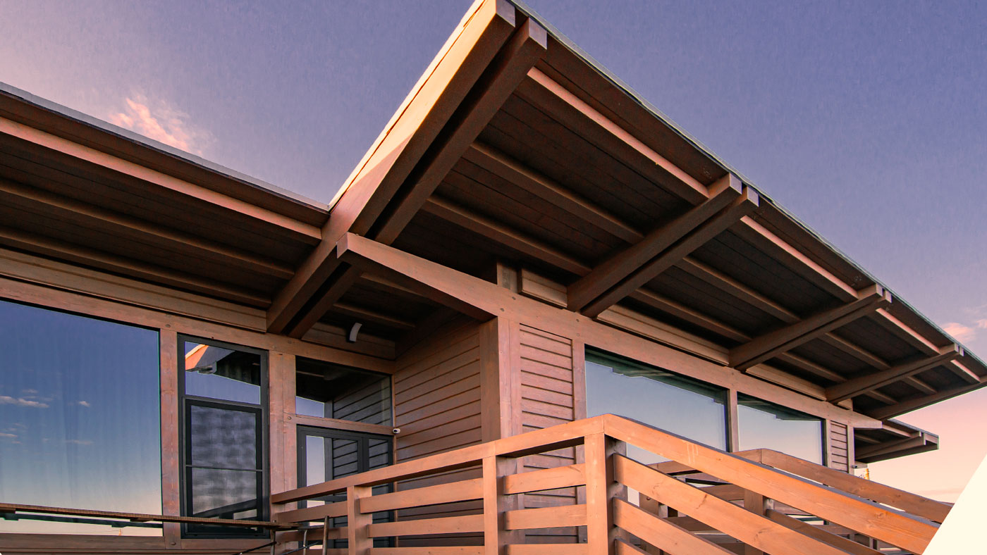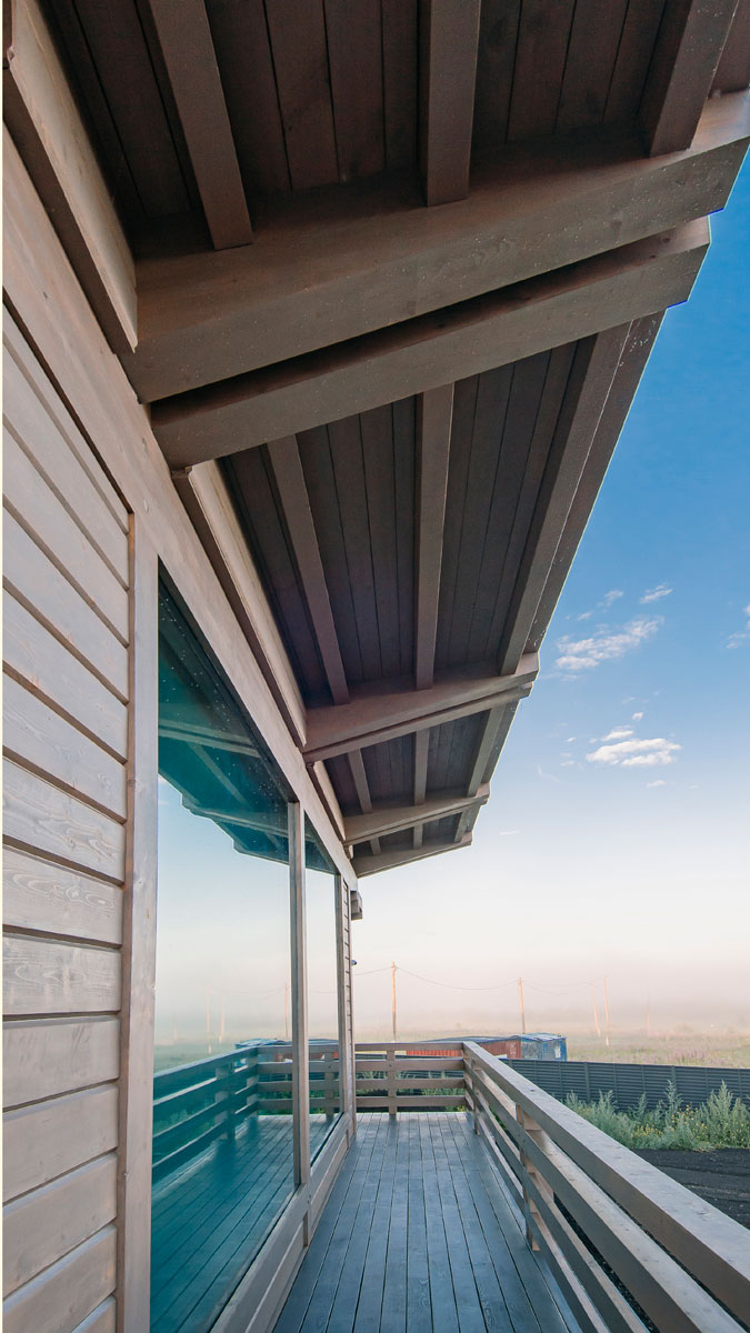 Идеальным строительным материалом для данной задачи стали деревянные конструкции. Несущие конструкции из клееного бруса - стоечно-балочная система, что позволяет избавиться от усадки всего дома. Стены комбинированные - часть из профилированного бруса, часть заполнена каркасными стенами. Сами конструктивные деревянные элементы видимые в интерьере и экстерьере. Все детали приходят на площадку готовыми и не требуют дополнительной обработки на месте.