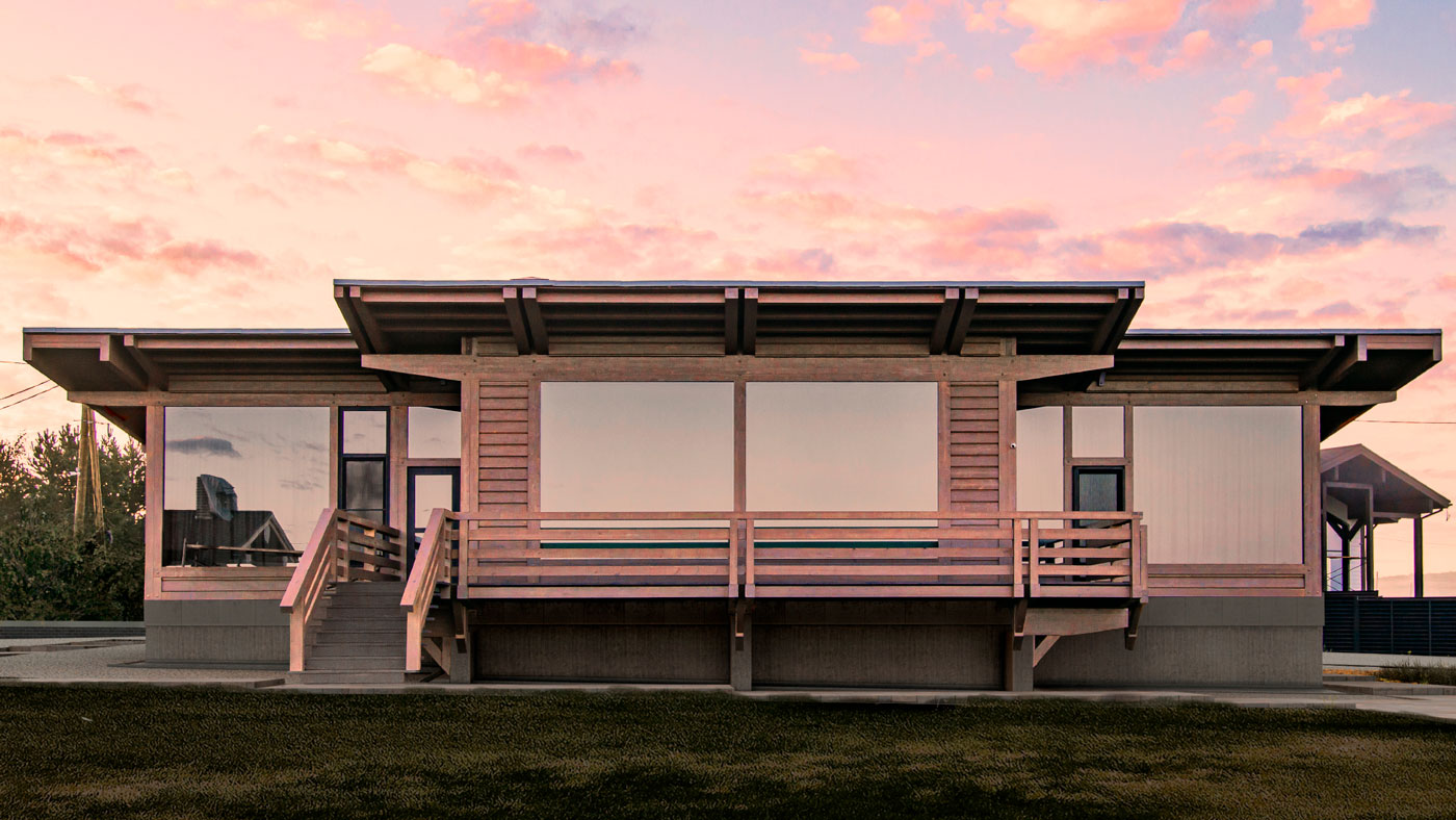 Самой главной ценностью проекта стало место строительства. Дом расположен недалеко от природного заповедника. Проектом предусмотрено большая площадь остекления, все они располагаются по стороне, где открываются панорамные виды заповедника. Вдали от городской суеты и ближе к природе. В доме предусмотрено всё, чтобы не отвлекаться от медитативных видов - просторная кухня-гостиная, спальные комнаты для детей и взрослых, открытая терраса. Она же приподнята от земли и подсвечена, а в вечернее время создаёт ощущение левитирующего дома над землёй.