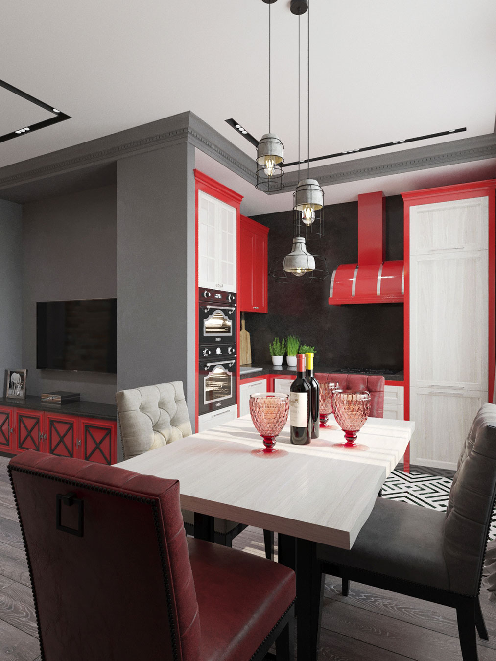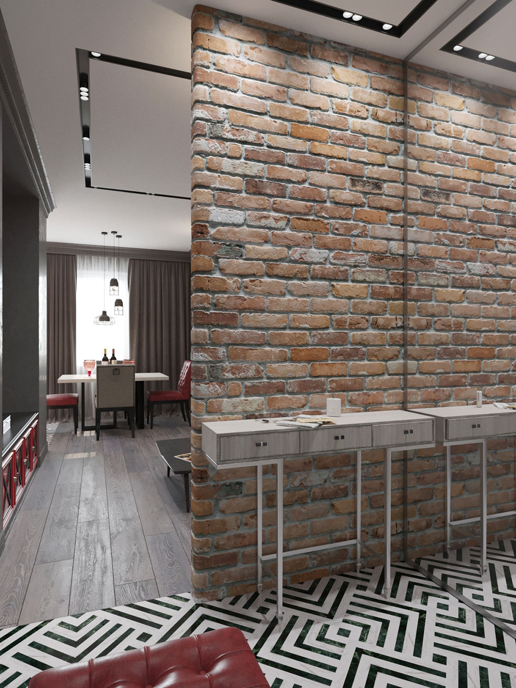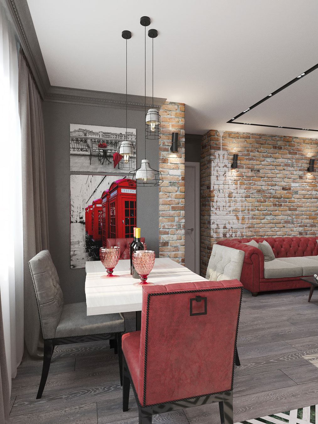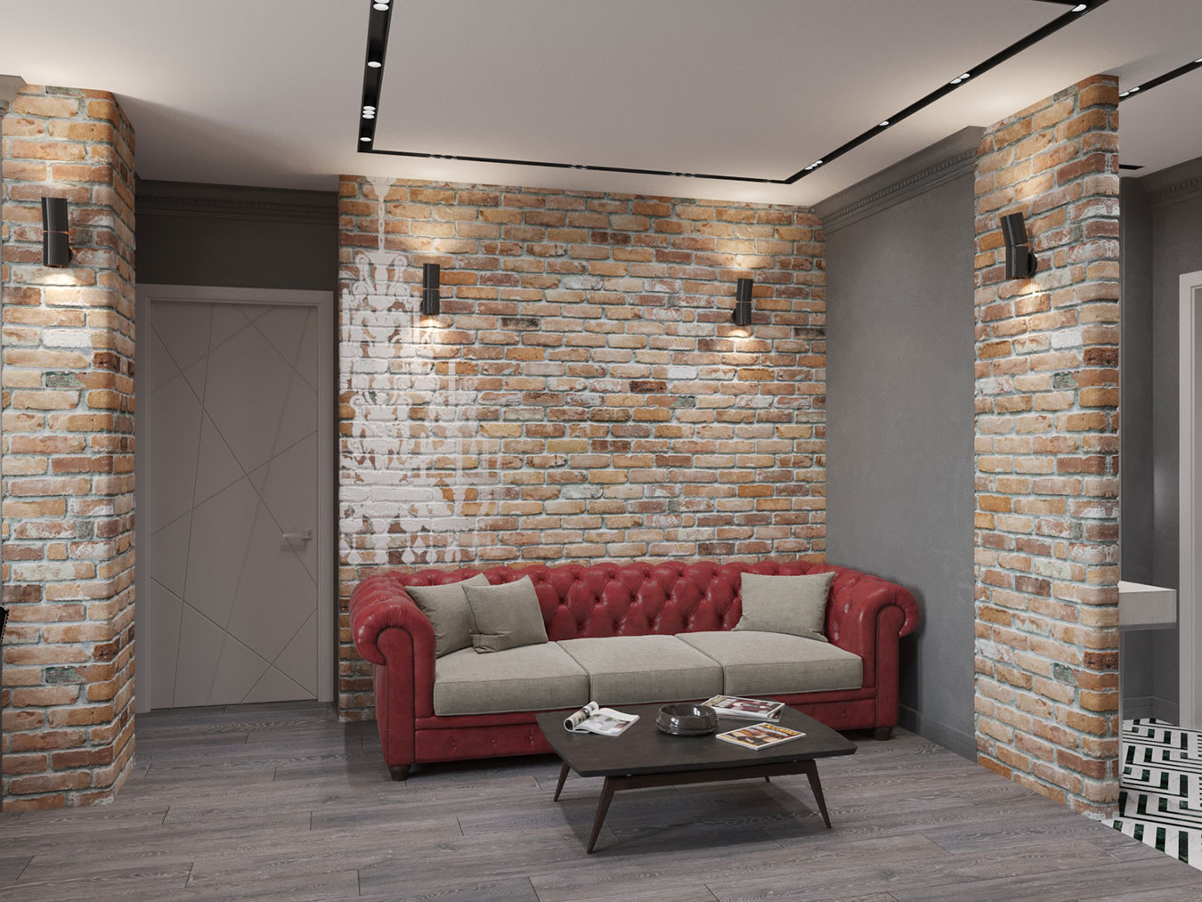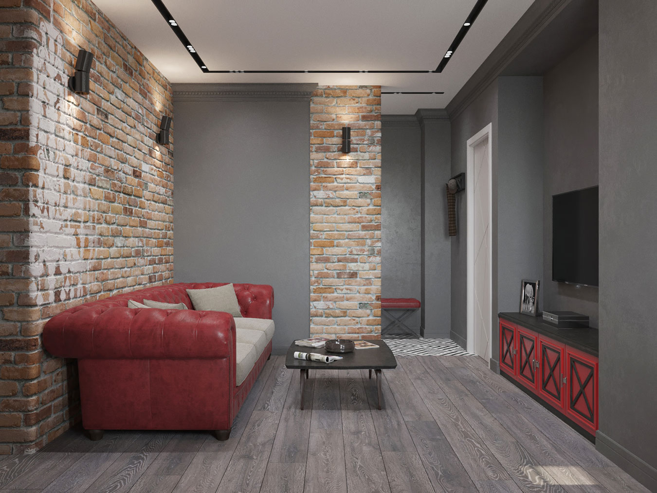 В качестве стиля для оформления выбрали облегченный «домашний» лофт с элементами английского стиля. Естественно, доминантой гостиной сделали диван «Честерфилд» как показатель хорошего вкуса владельца. Это тот предмет мебели, в котором сочетаются история, традиции и элегантность. Вновь набравшая популярность модель данного дивана теперь предлагается не только в классической темно-коричневой коже, но и в ярких смелых цветах. «Мужские» тона, брутальный кирпич, сочные акценты, техническая оснащенность — основные составляющие интерьера современного молодого мужчины.