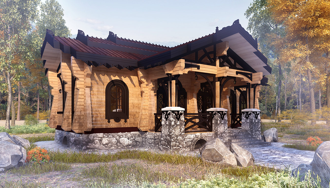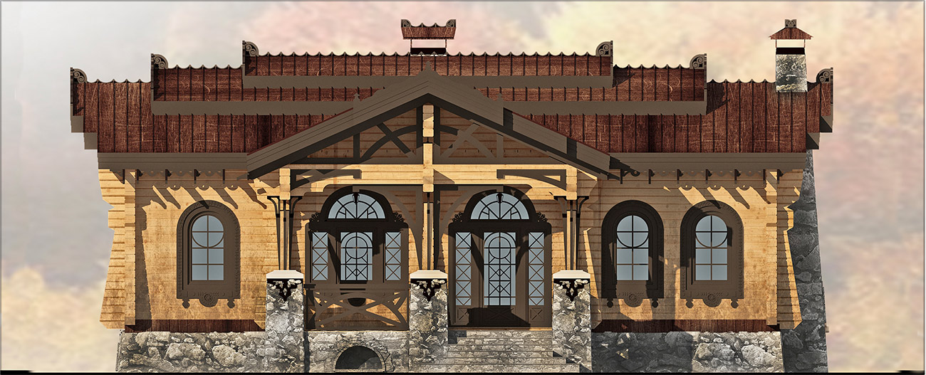 Оригинальный проект домика выполнен в сочетании сразу трех архитектурных стилей, что выражается в эстетике фасада за счет цокольного каменного основания со столбами, декоративными фермами, наличниками и колористическим решением.