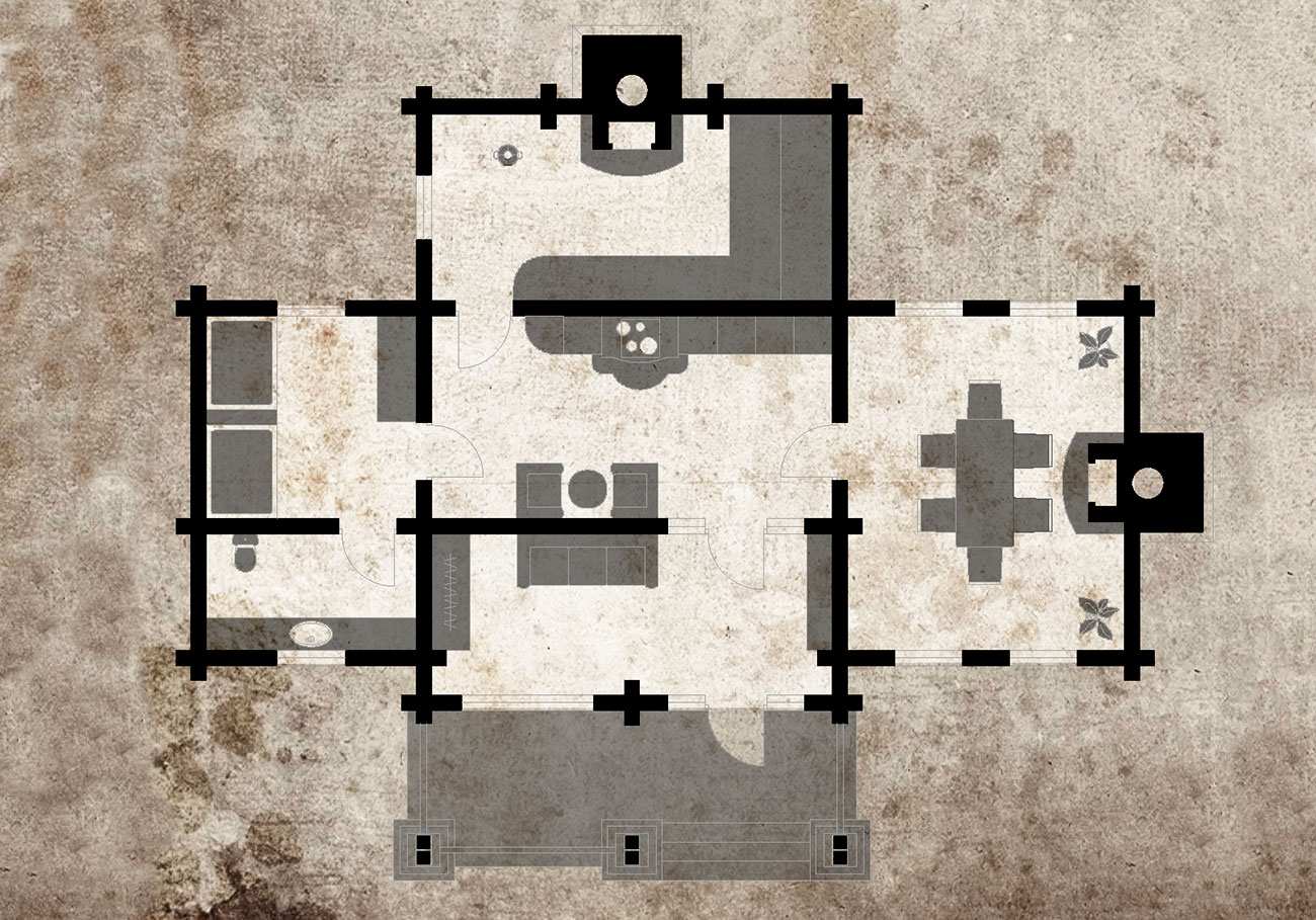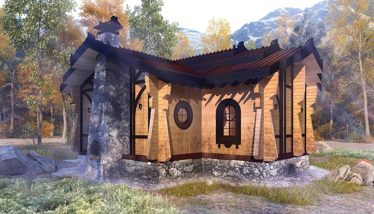 Внутреннее пространство максимально оптимизировано для приема водных и парных процедур. В одноуровневом этаже разместились: просторный тамбур, гостиная с кухней, обеденная с камином, парная комната, помещение с душем-купелью и санузел. Яркий облик и миниатюрность архитектурного восприятия — главная реализованная задача проекта.