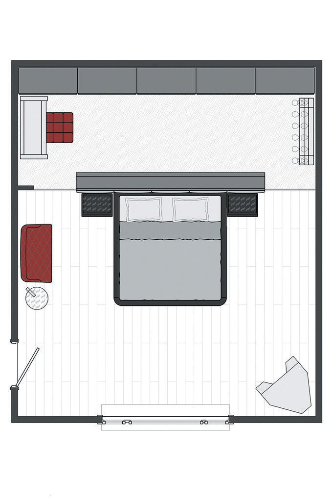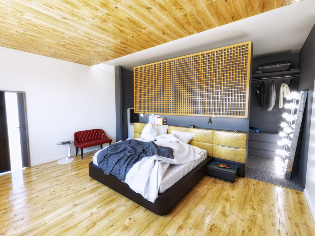 В соответствии с выбранной дизайн-концепцией интерьер современной спальни представляет собой стилизованную гримерную, где могут воплощаться любые образы. Для оформления спальной зоны использованы светлые оттенки дерева и белый цвет для стен, символизирующих чистый лист бумаги. Удобная гардеробная выполнена в серых тонах, чтобы ничто не мешало процессу перевоплощения.