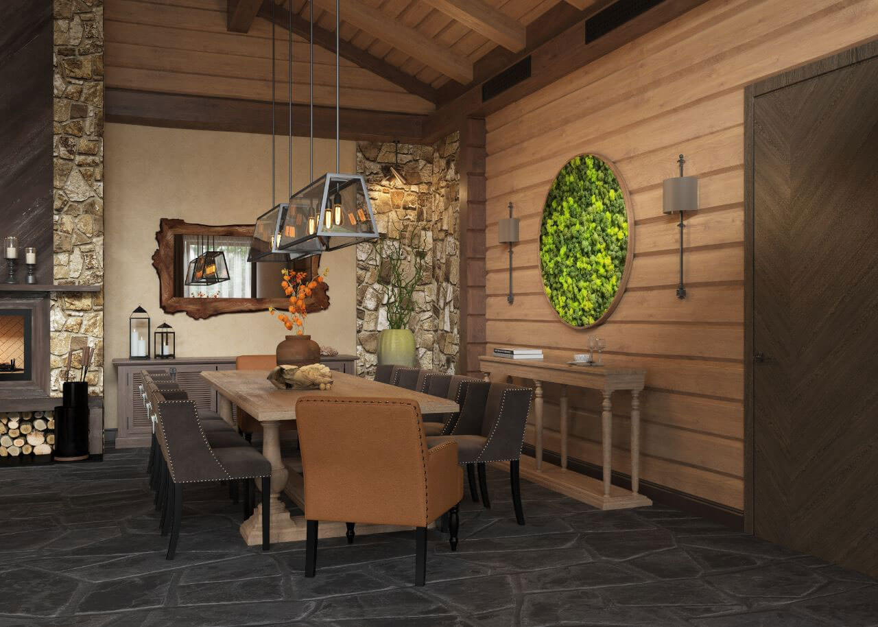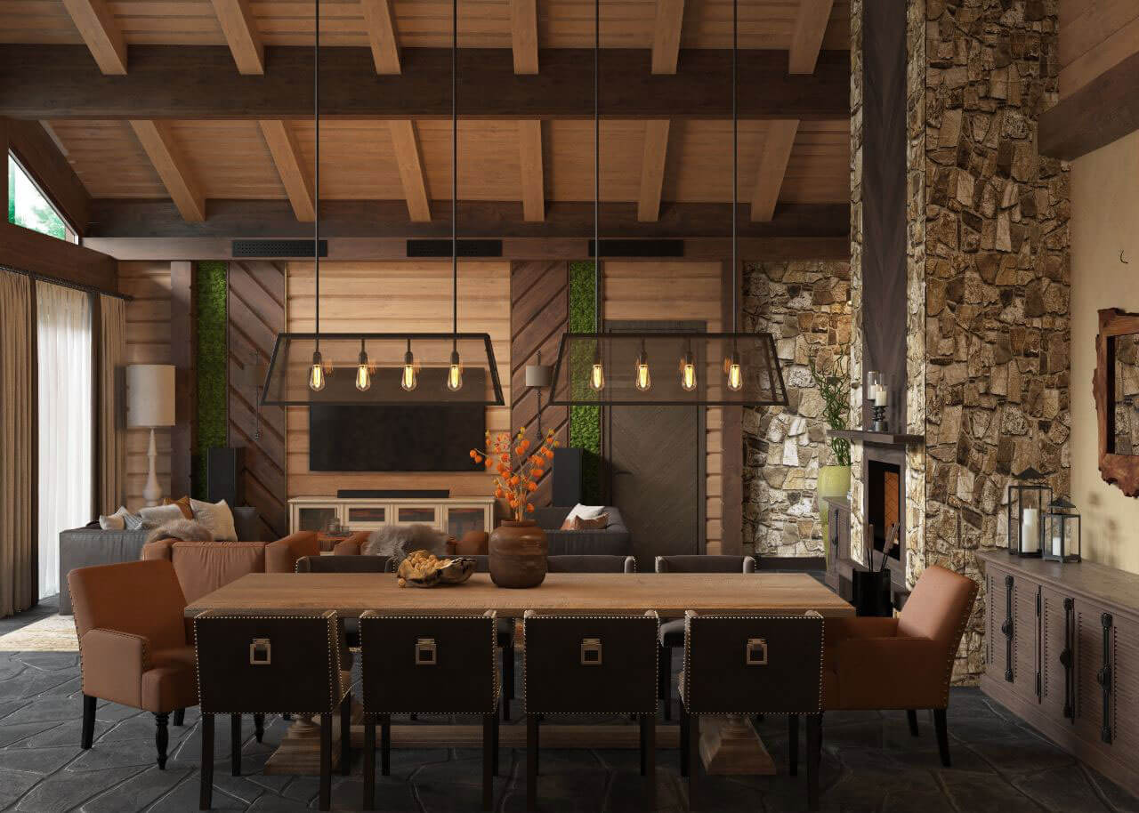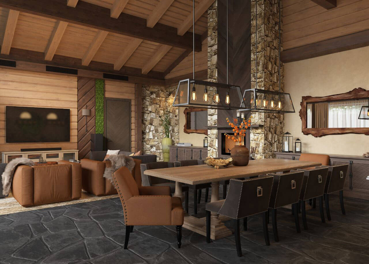Камин здесь занимает господствующее положение и аккумулирует на себе всю концепцию интерьера в стилистике Ранчо. Камин дровяной, дымоход его полностью зашит в единую конструкцию камина. Облицован натуральным рваным камнем – плитняком, обнажающего грубую и необработанную каменную породу.