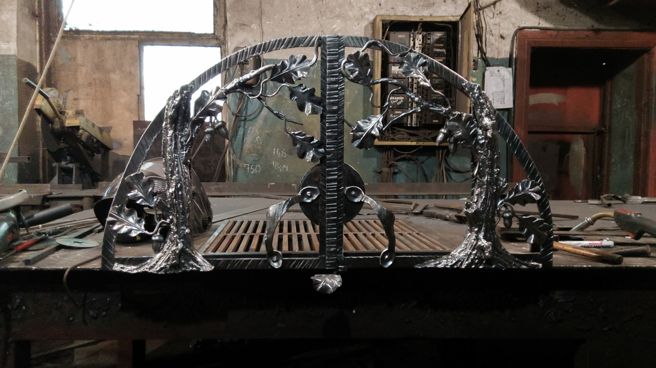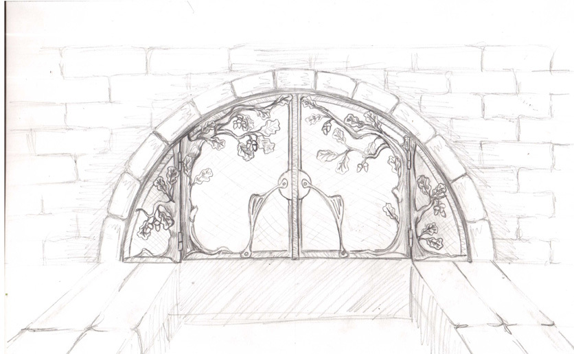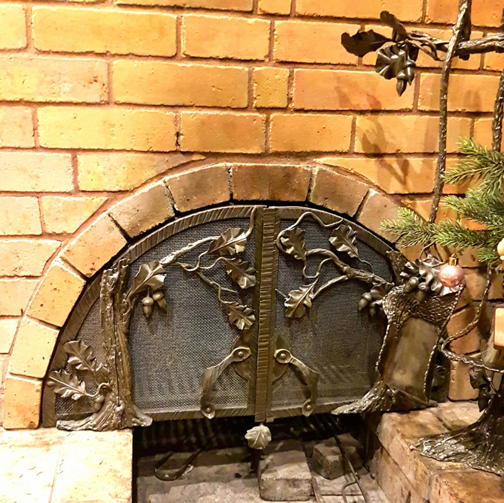В камин переоборудована кухонная печь-плита в старом доме. Использован имеющийся дымоход. Фасад собран из огнеупорного кирпича. По форме топки изготовлена каминная решетка с использованием растительных орнаментов в стиле «Дубовая роща».