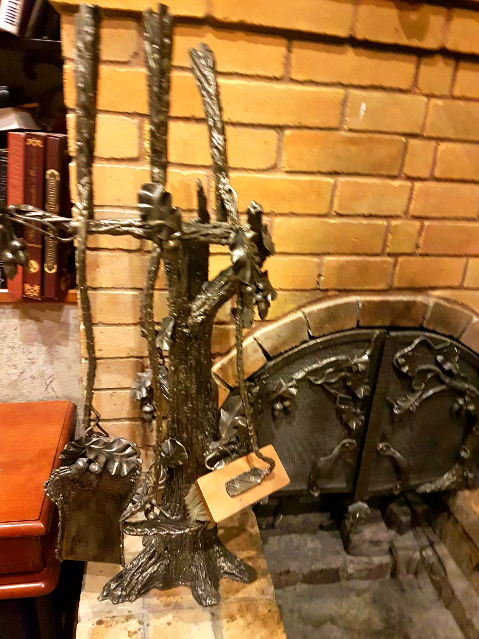 Набор каминных принадлежностей выполнен в той же стилистике, что и решетка, но является отдельным изделием. Он не крепится к решетке, а устанавливается рядом на кирпичный постамент.