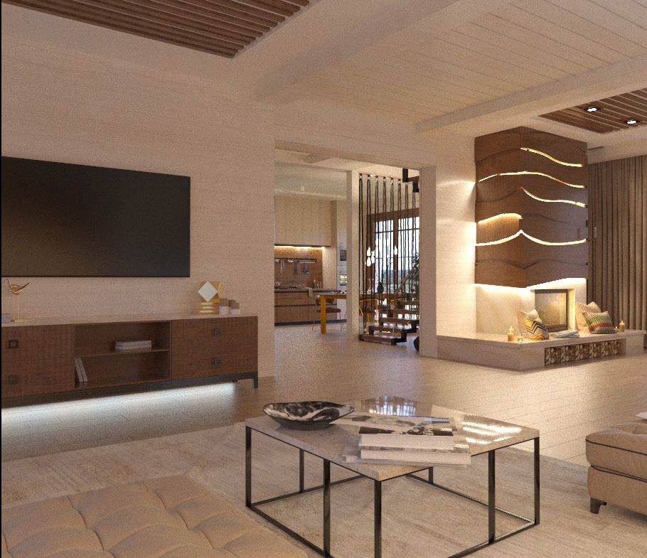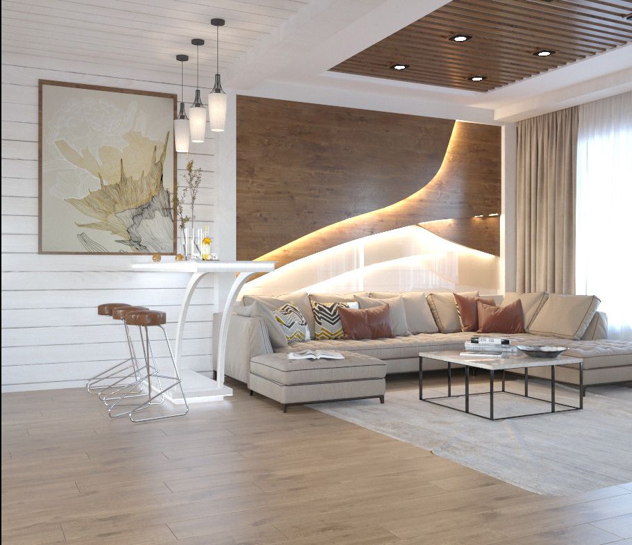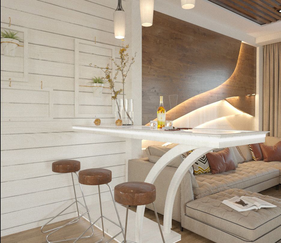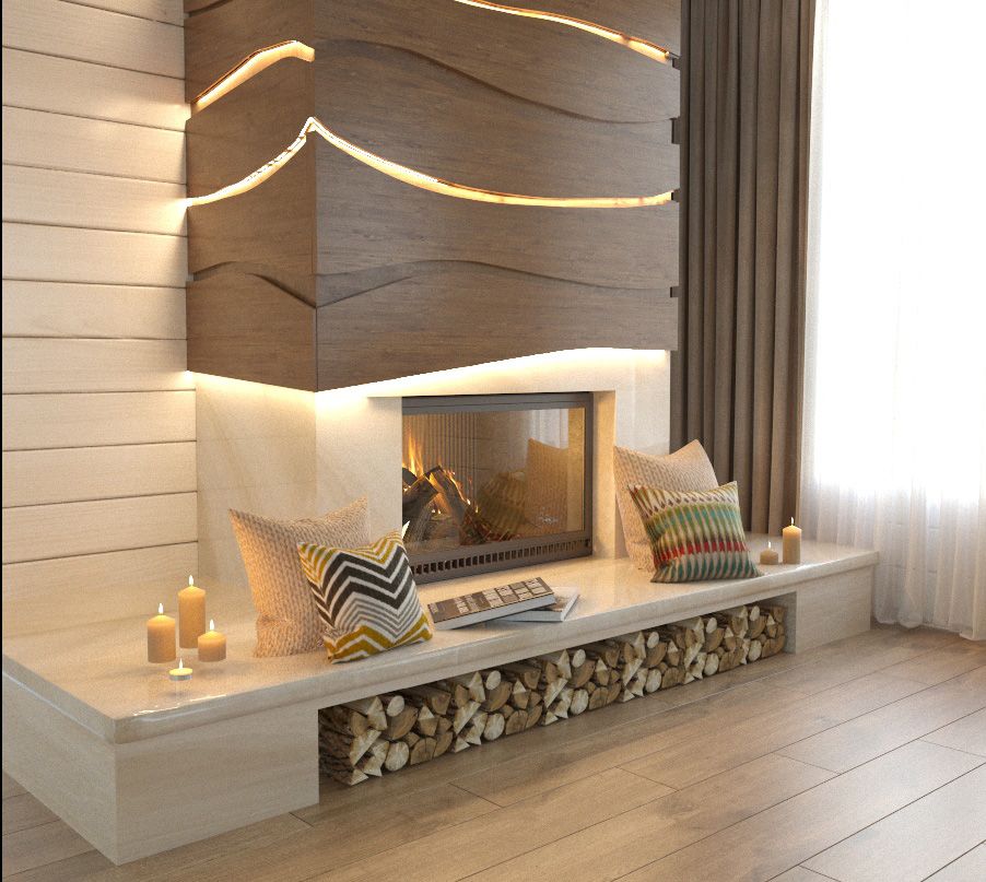 В облицовке камина использован тонкий керамогранит с фактурой дерева и с линейной, гибкой диодной подсветкой. Этот же материал и за спинкой дивана. У камина кофейная мягкая пара с деревянным декором на спинках, подобранным под цвет декора на камине. В этом же цвете выполнены обивка барных табуретов, зонирование потолка.