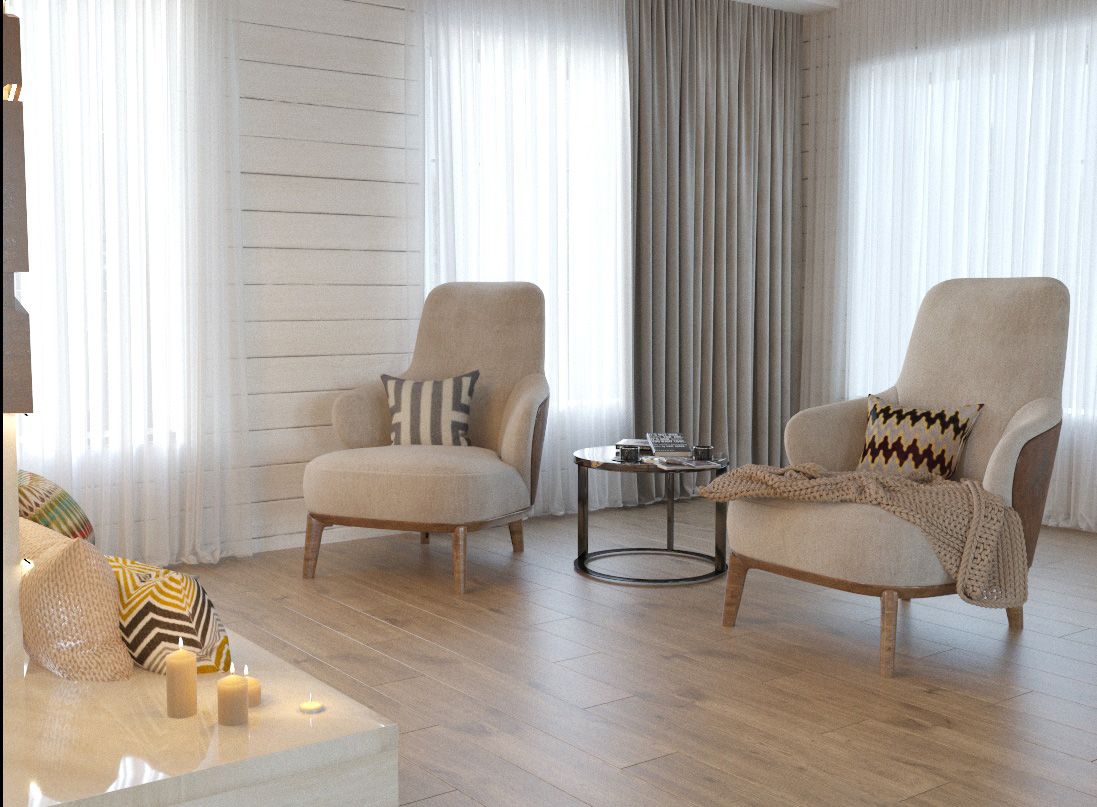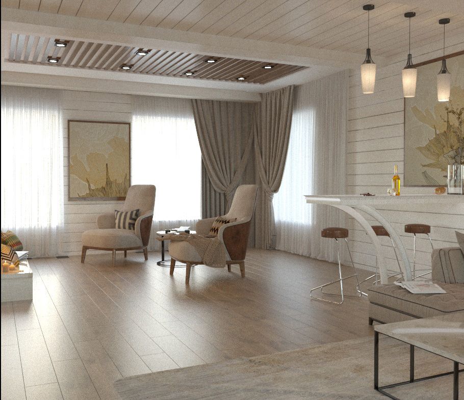 В шикарном доме из клееного бруса весь первый этаж нужно было оформить как зону отдыха с зоной приема гостей. Задачи — максимально открытое пространство, больше воздуха, больше простых и интересных решений, теплые цветовые решения, зонирование пространство за счет расстановки мебели и оборудования, минимум стен, объединенная столовая-гостиная.
