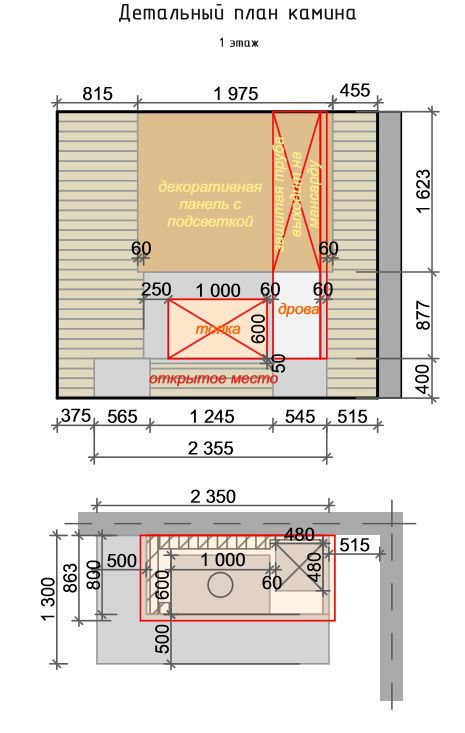 Проектирование началось с разработки камина и его концепции, так как именно он является сердцем этого дома. Топка у камина небольшая (80 см), поэтому за счет интересного дымохода и широкого каменного основания с сидячими местами у камина был увеличен объем и центральным элементом остался именно камин.
