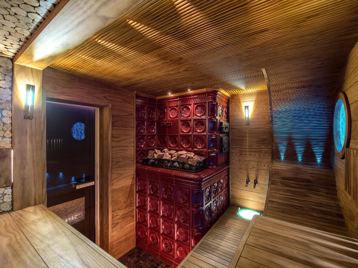Настоящая баня должна иметь дровяную печь с серьезным запасом тепловой мощности, а отделка изразцами благородного тона сделала ее произведением искусства, притягивающим взгляд и подчеркивающим статус.