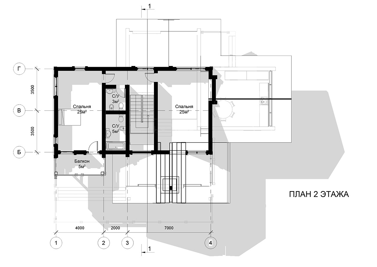 Второй этаж полностью отдан под ночную зону. Здесь располагаются две просторные спальни (в одной из них предусмотрено гардеробное помещение, в другой есть балкон), а также большая ванная. На террасе можно устроить летнюю зону отдыха (выходы спроектированы из большей спальни). Санузлы, расположенные один над другим, позволяют быстрее и легче провести в доме водопровод и канализацию.