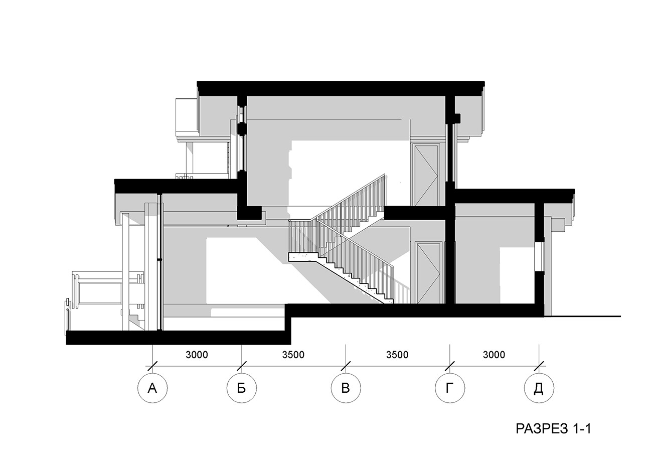 Большие удлиненные окна гарантируют прекрасное естественное освещение комнат и дарят ощущение единства с природой. На первом этаже сформирована зона отдыха, в которую входят просторная гостиная с камином. Устроенный у внутренней стены гостиной камин наполняет помещение теплом и уютом. Также на первом уровне расположена кухня и большая прихожая, в которой отведено место под вместительный шкаф.