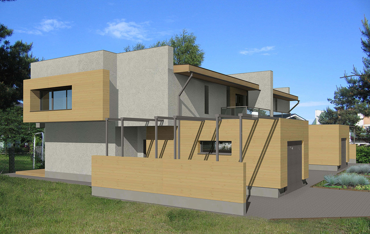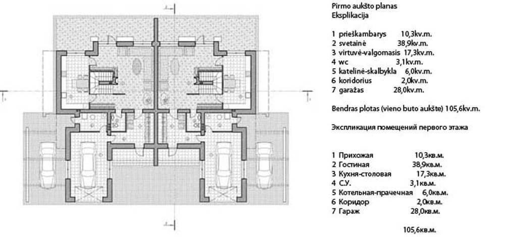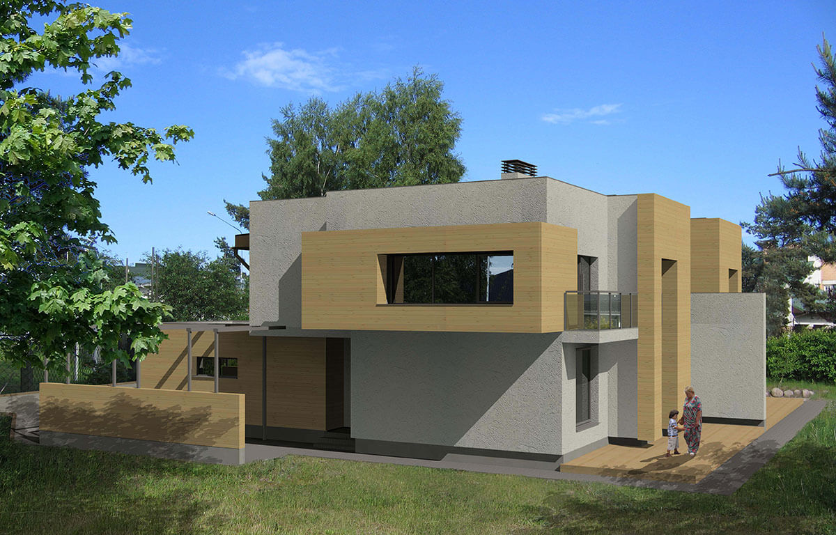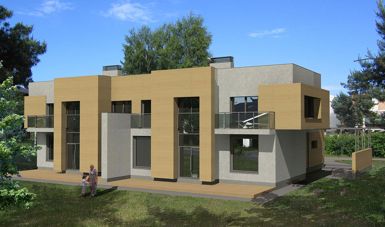 Дом предназначен для проживания двух семей из 3–4 человек. Он рассчитан на застройку небольших земельных участков (6–8 соток для каждой части дома).