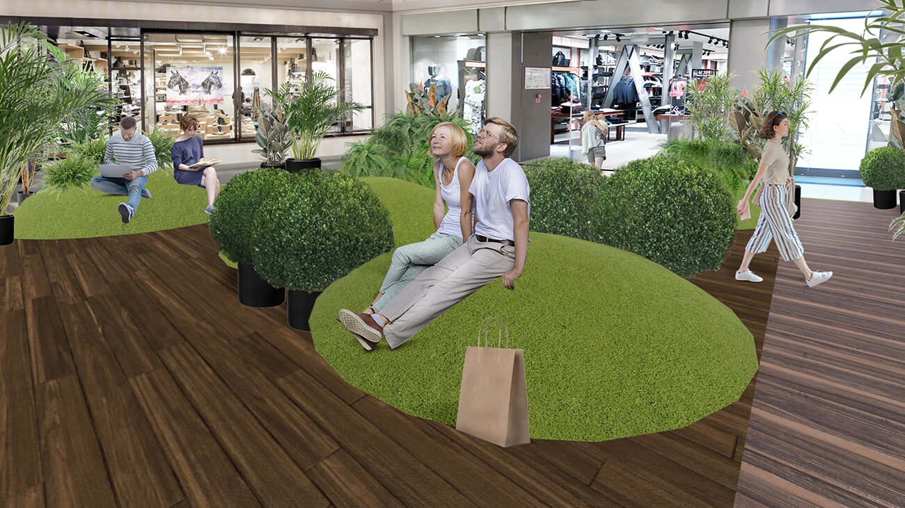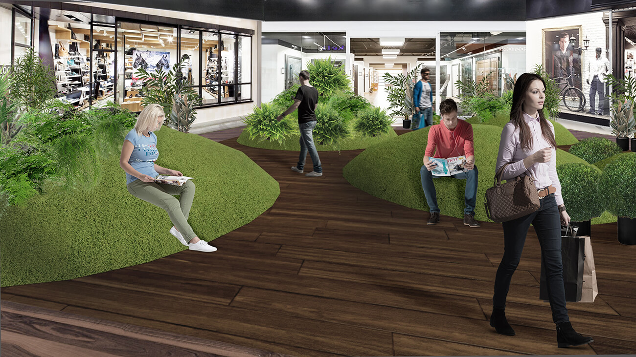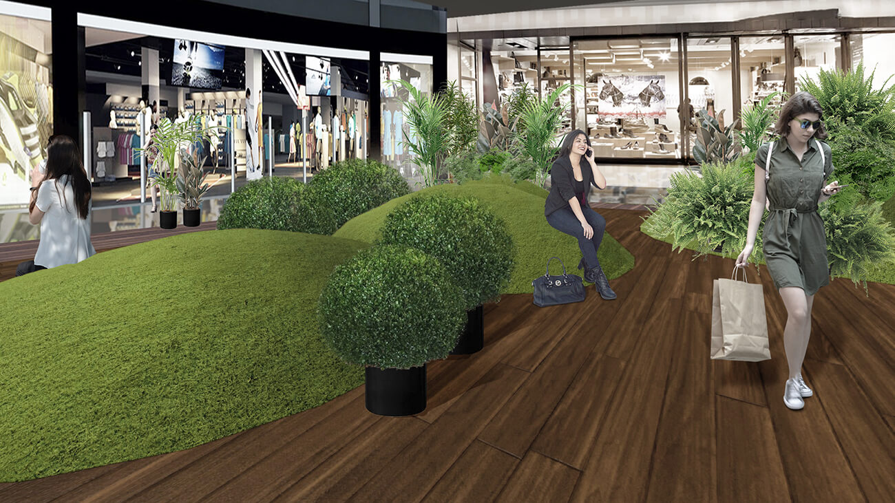 Мой сад — интеграция живого ландшафта в зазеркалье витрин и магазинов. С помощью геопластики посреди ТРЦ появились зеленые холмы, где так приятно отдыхать и делать фотографии. При этом каждый сам выбирает свой уголок: аккуратные самшиты создают атмосферу европейского парка, а пальмы и папоротники погружают в мир дикой, нетронутой человеком природы. Напольное покрытие выполнено из натурального дерева, а кашпо — из керамики, что создает атмосферу естественной локации.