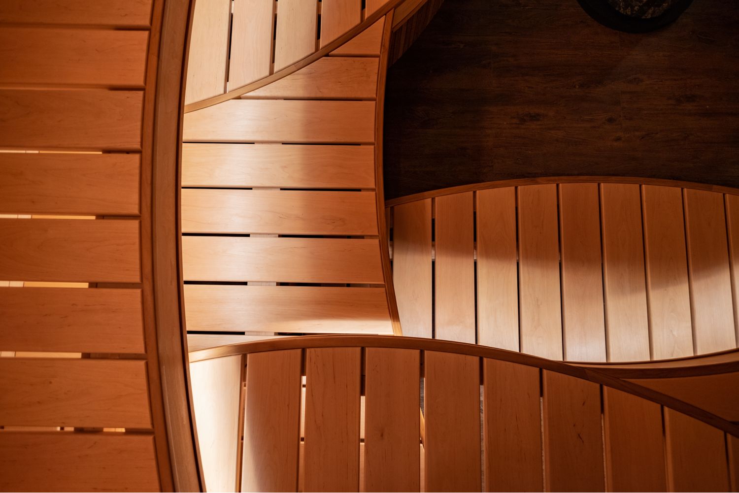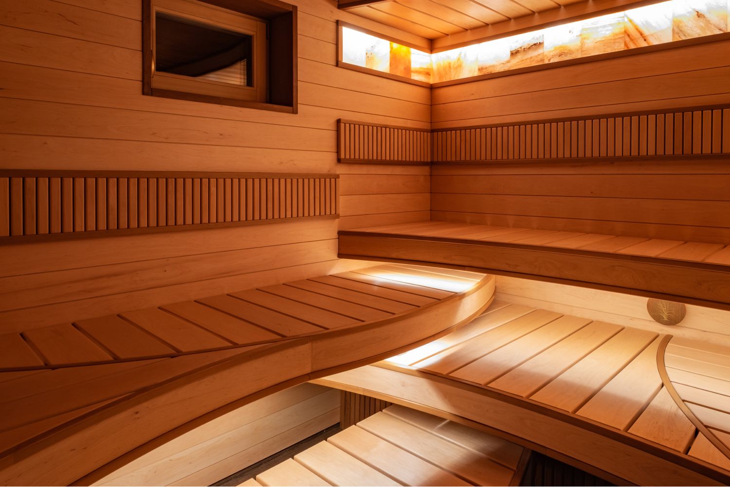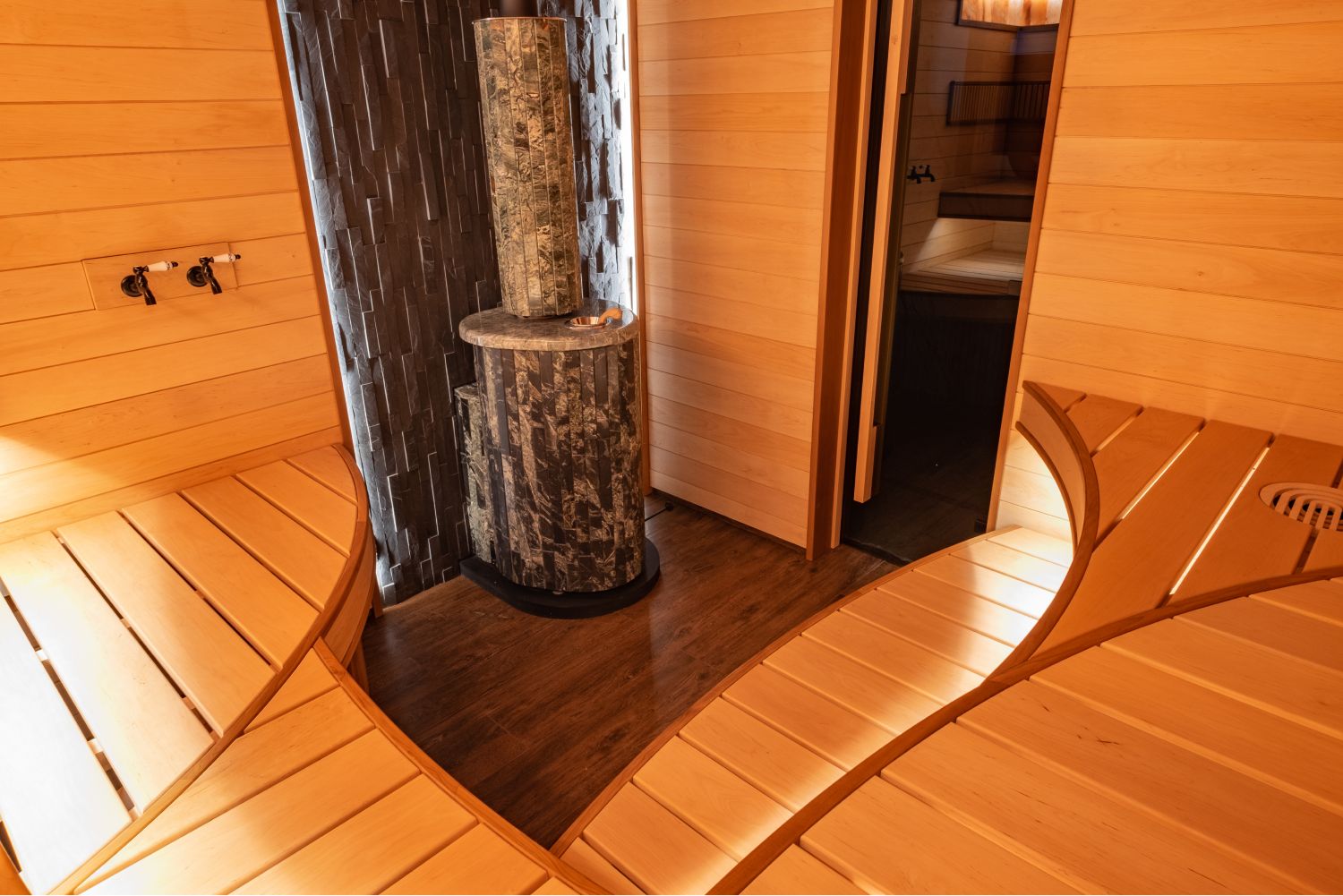Вроде бы обычная сауна, но решение лежаков с применением изогнутого дерева, придаёт проекту уникальность