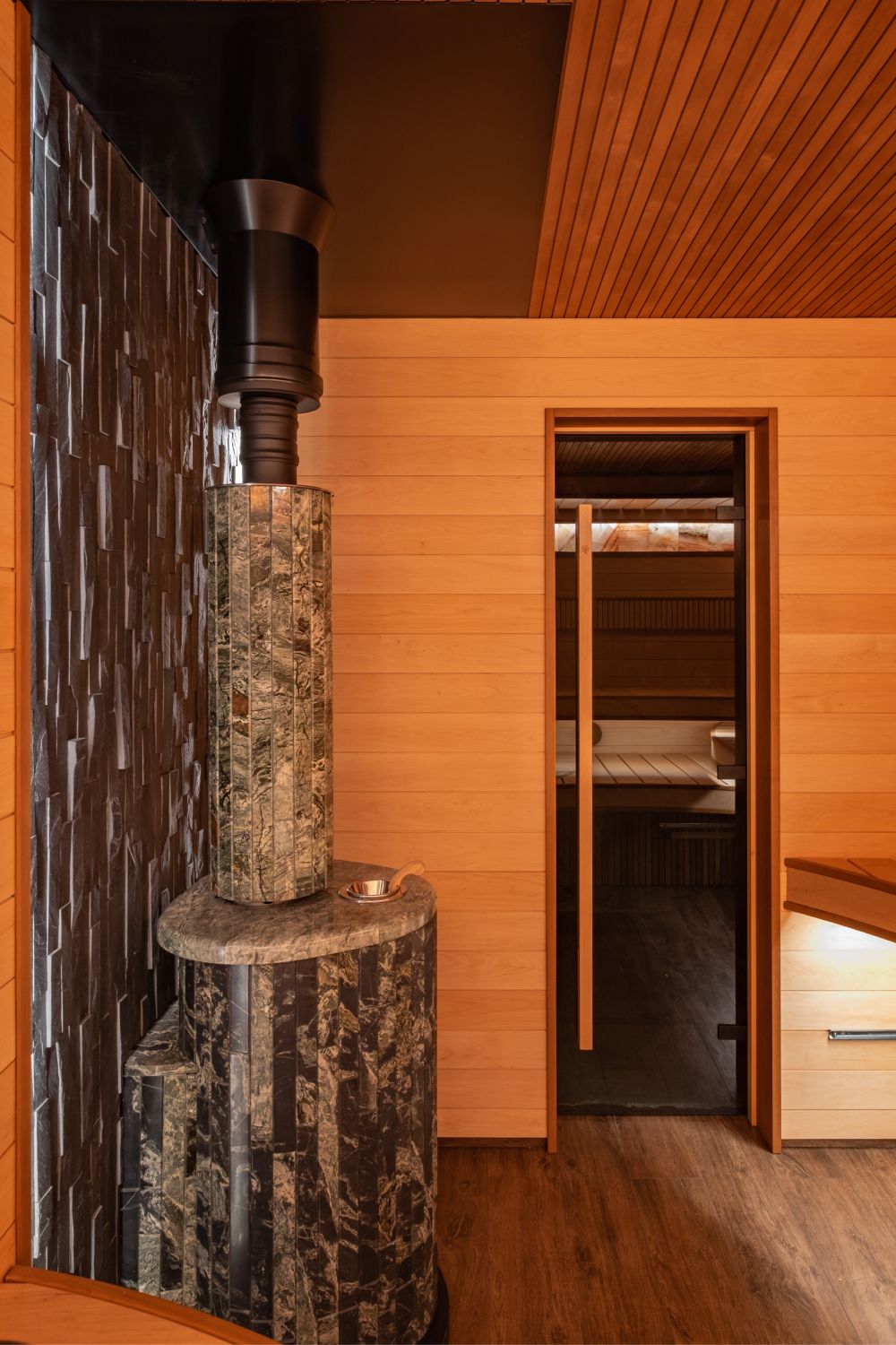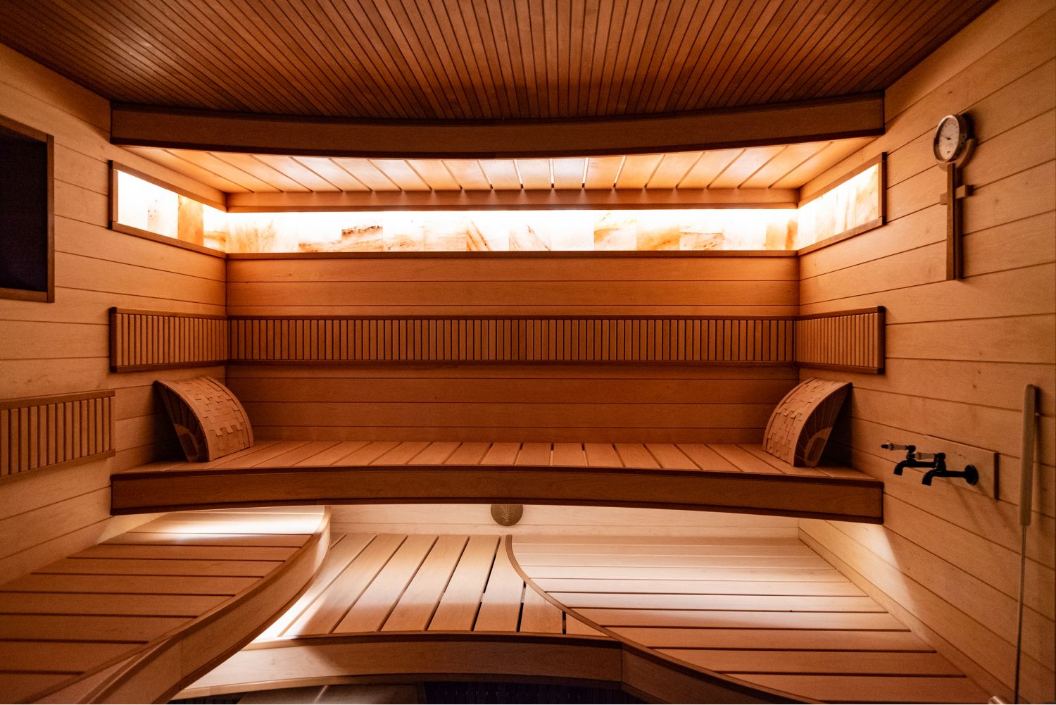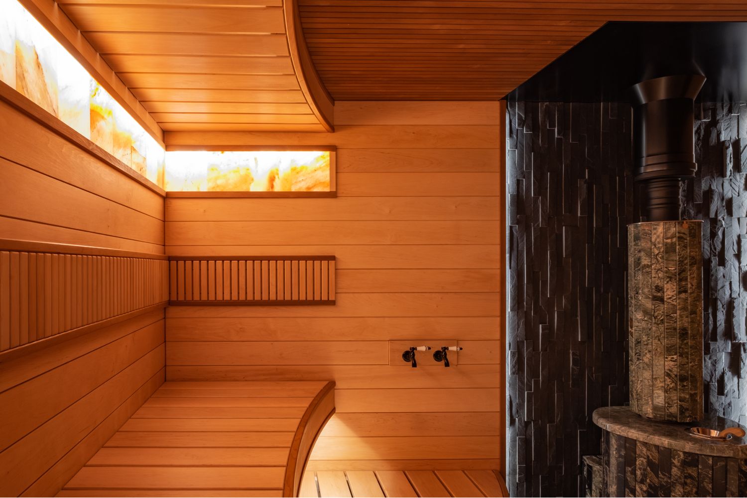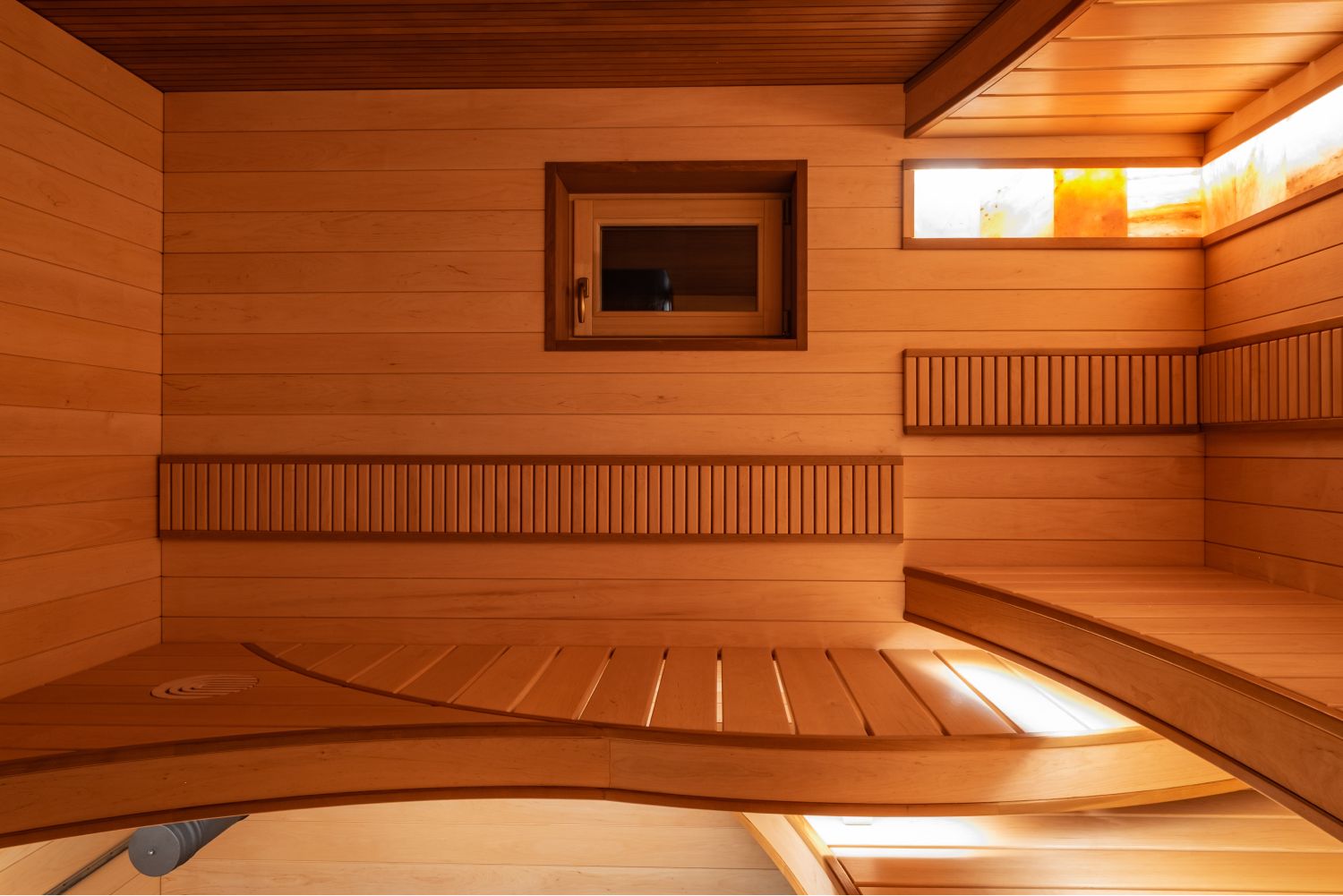 Вроде бы обычная сауна, но решение лежаков с применением изогнутого дерева, придаёт проекту уникальность