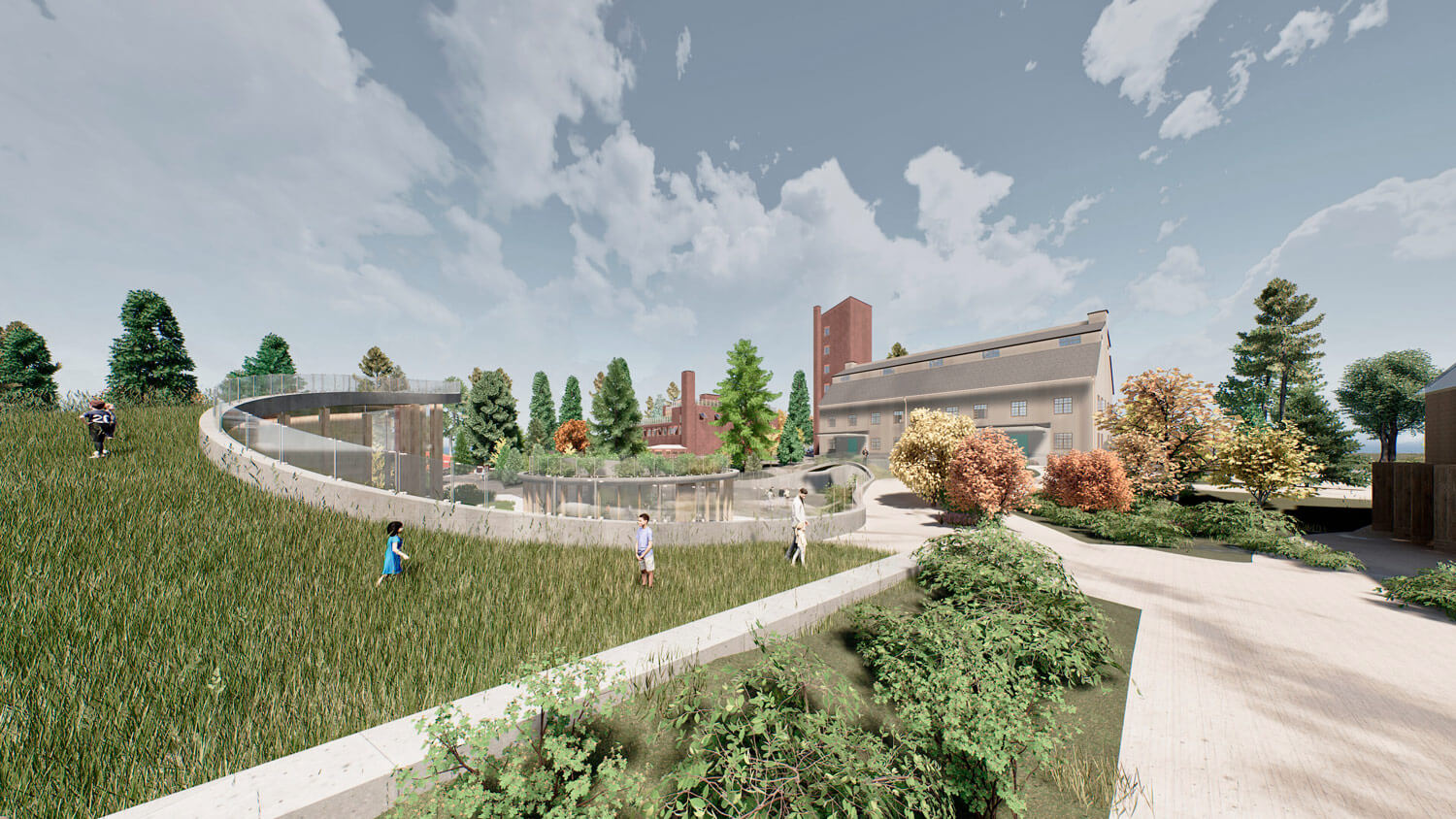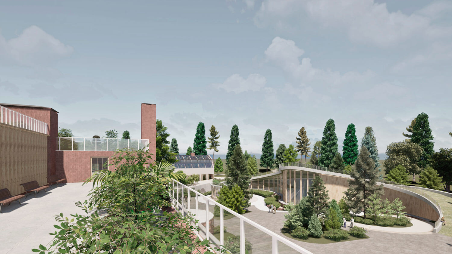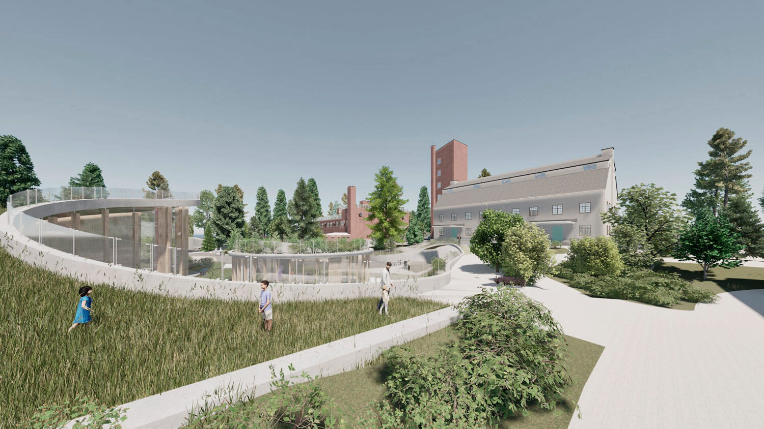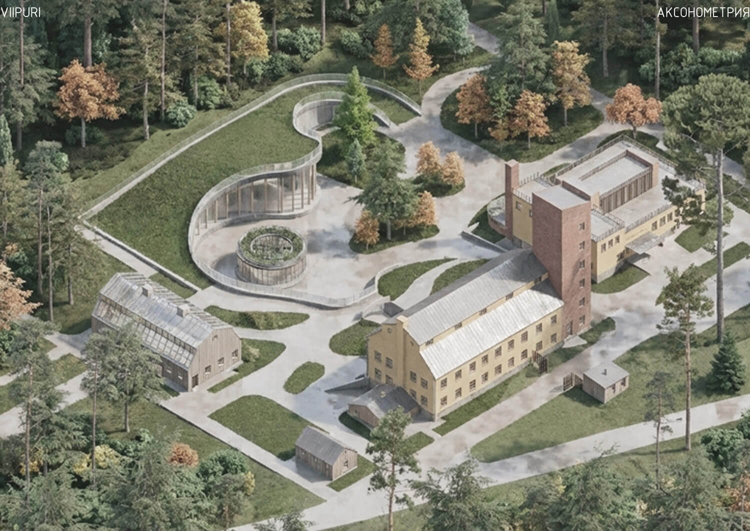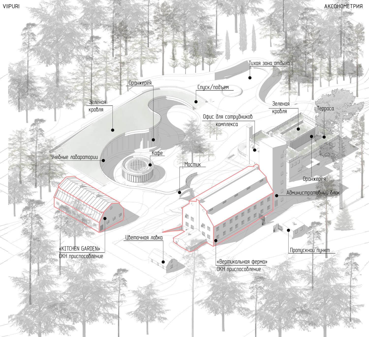 Территория, окруженная лесом, органично интегрируется в природный контекст. Существующее природное окружение сохраняется и дополняется новыми ландшафтными решениями, формируя ощущение непрерывности среды. Пространство преобразуется в городской сад, где индустриальное прошлое мягко растворяется в живой растительной среде.