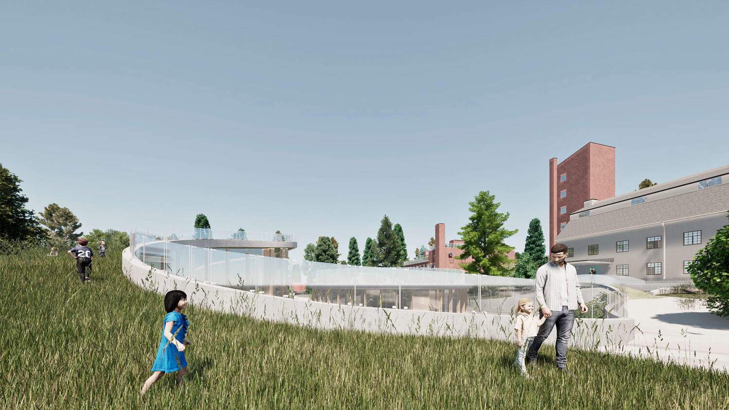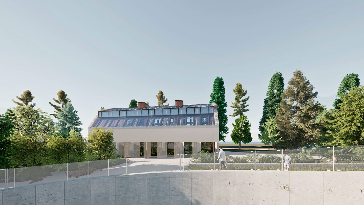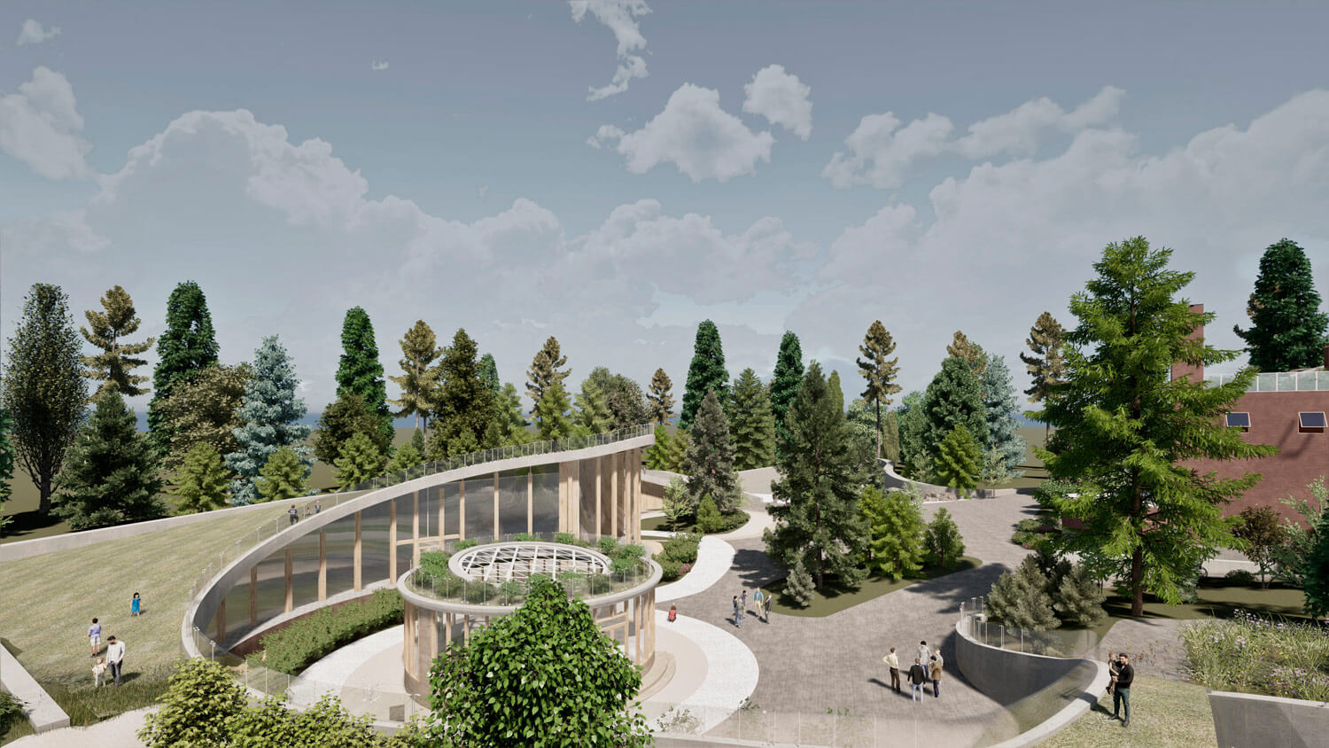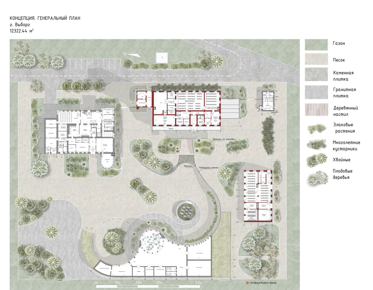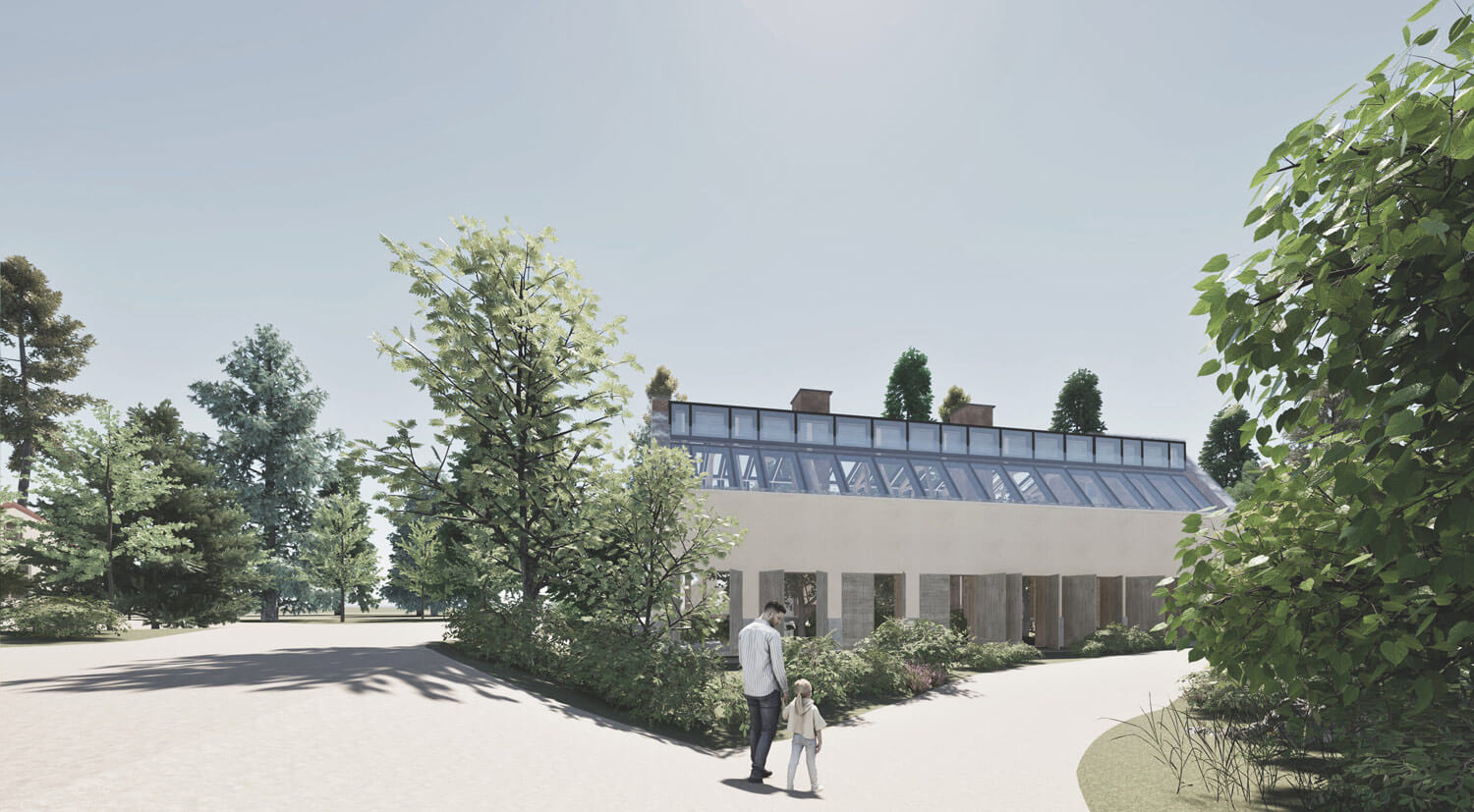 Территория, окруженная лесом, органично интегрируется в природный контекст. Существующее природное окружение сохраняется и дополняется новыми ландшафтными решениями, формируя ощущение непрерывности среды. Пространство преобразуется в городской сад, где индустриальное прошлое мягко растворяется в живой растительной среде.