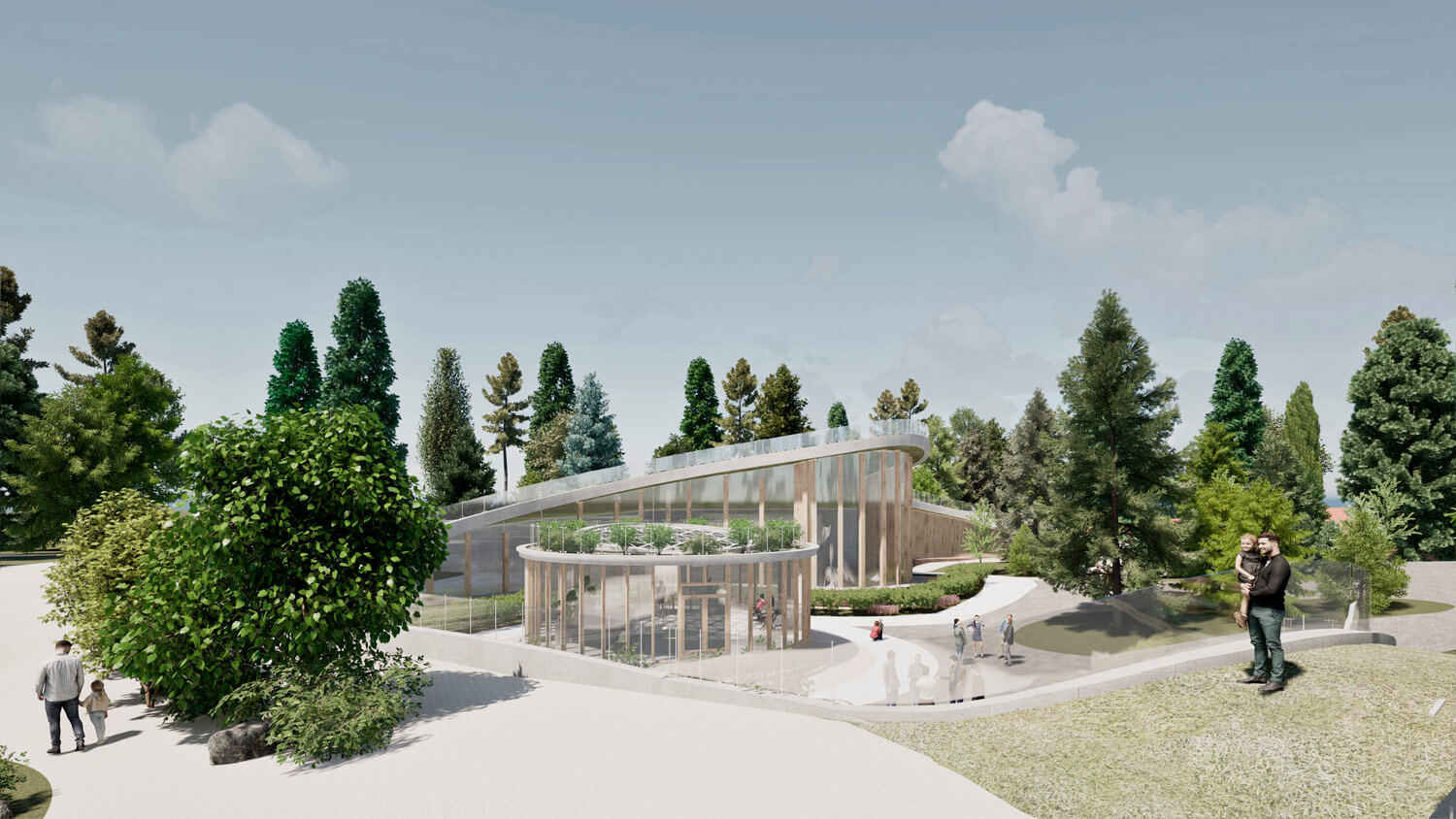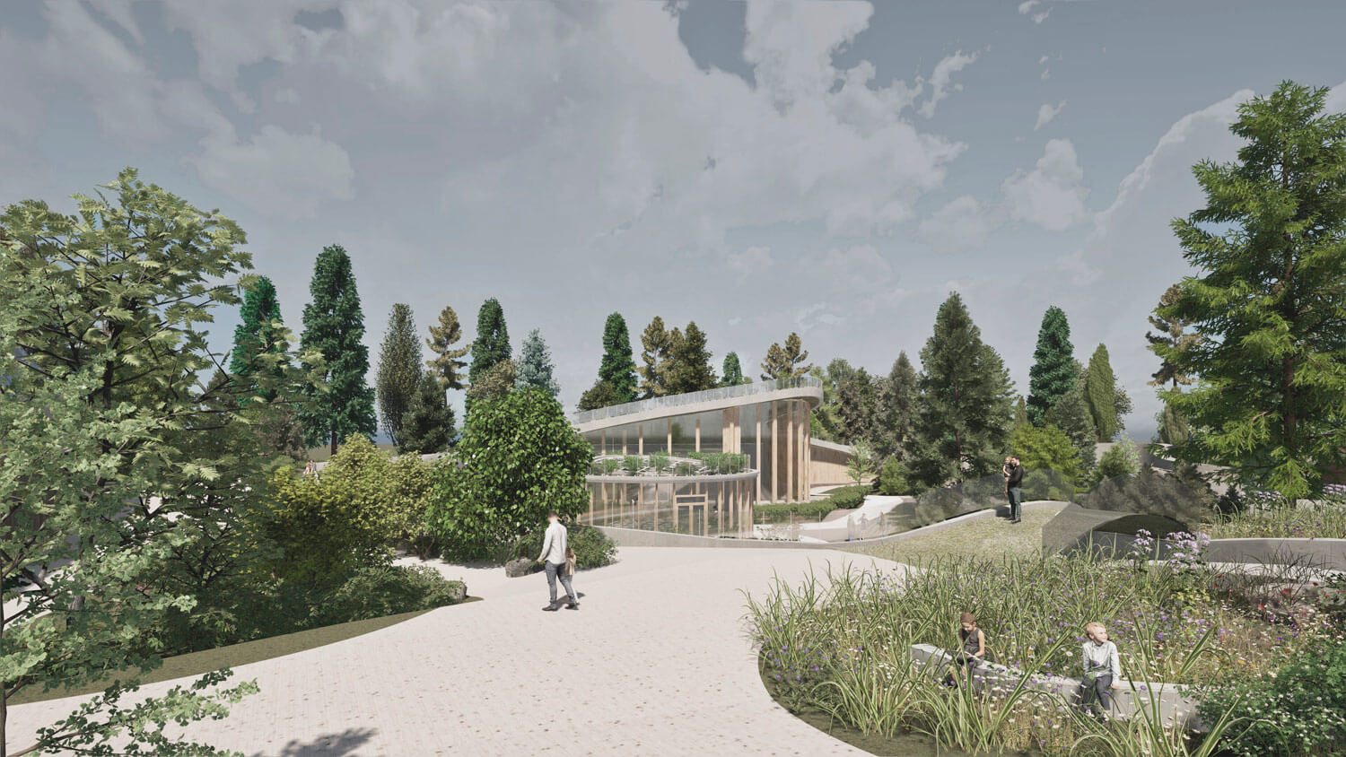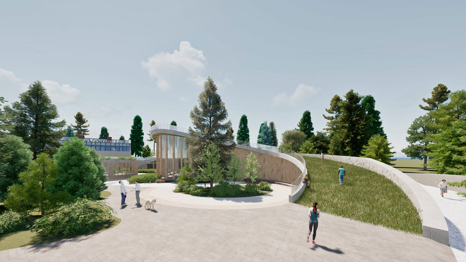 Дополнительным элементом общественной активности становится кафе, интегрированное в среду и ориентированное на взаимодействие с природой. Оно становится точкой притяжения и одновременно частью спокойного, созерцательного сценария пребывания.