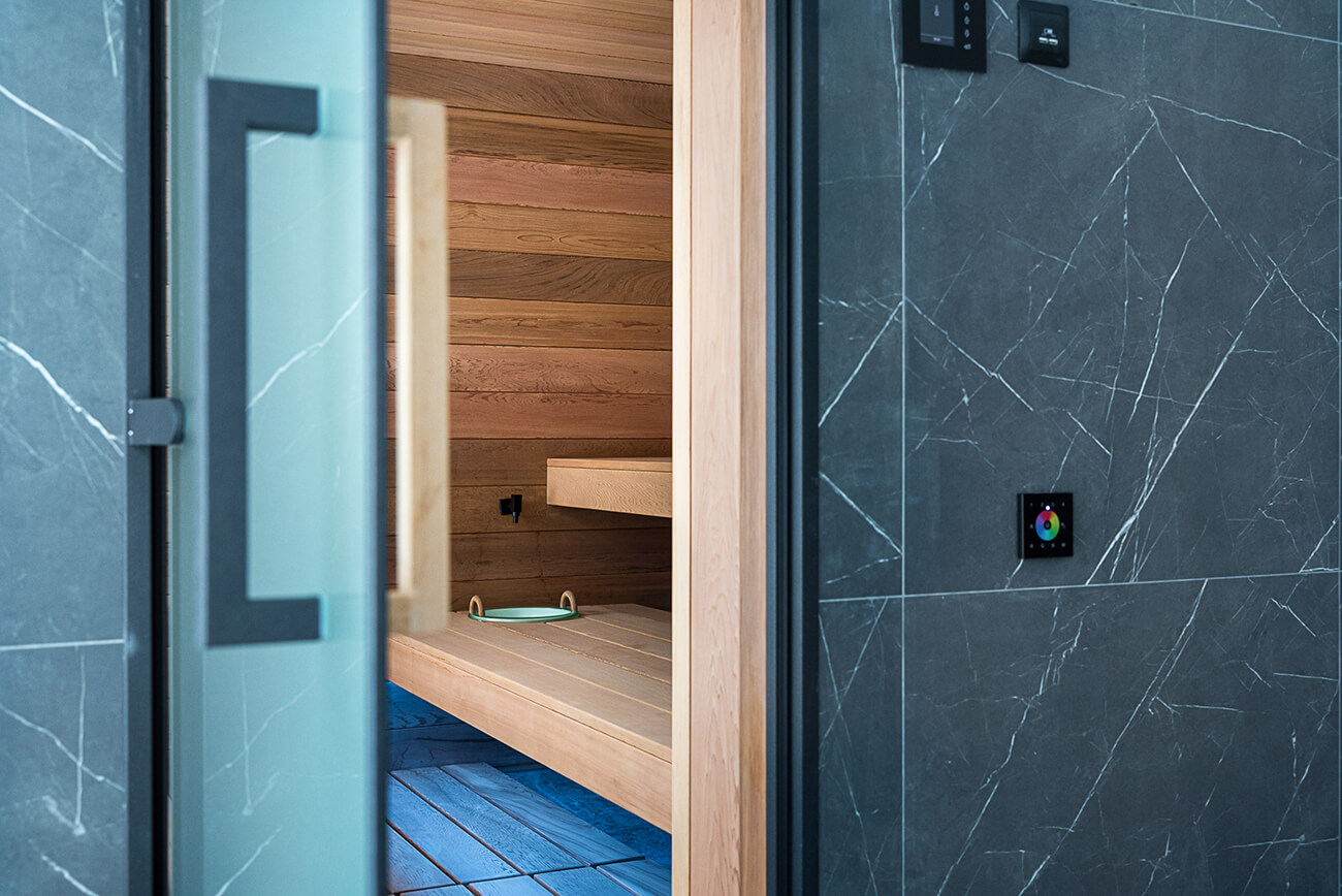 Сдержанный стиль, вкус и благородство владельцев воплотились и в выбранной ими термальной зоне. Сауна из канадского кедра выполнена фабрикой SibHolz (Новосибирск), оснащена печью Mythos S45 CRS 15 кВт с двумя парогенераторами EOS (Германия). Дополнительно добавили регулируемое подполковое светодиодное освещение, аудиосистему, шайку с краном и автоподатчиком воды. Система воздухообмена дополнена вытяжными вентиляторами для ускорения просушки.