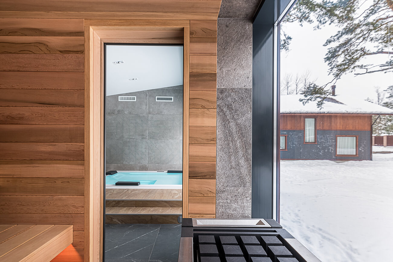 Остекление «впустило» естественный свет внутрь пространства, при этом сохранив возможность наслаждаться бассейном круглогодично. Смена сезонов за окном спа — отличный способ обновления интерьера благородными красками скандинавской природы.