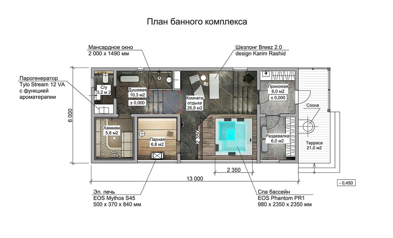 Хаммам запроектирован нейтрального цвета. Настоящее торжество света со множеством эффектных цветовых сценариев обеспечивают пиксельные панно «Дамаско» и «Геометрический узор», комплект «Звездное небо» и светодиодные подсветки бордюра, арки и потолка для эффекта «парящий потолок». Отделку хаммама дополняют мраморная курна и гигиенический душ.