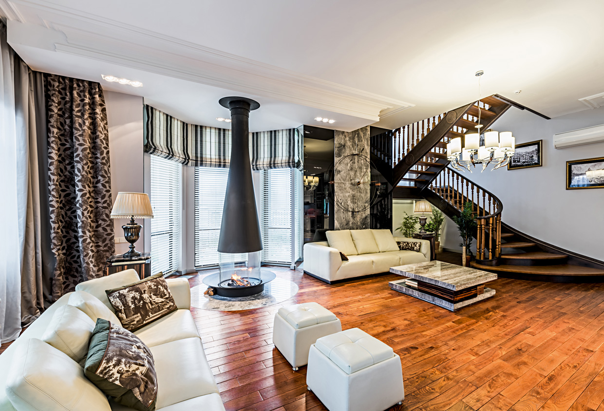 Центром гостиной стал камин с панорамной остекленной топкой, представляющий собой точную копию известной французской модели. Игра языков пламени смотрится особенно выразительно в окружении натуральных материалов — серого камня с красивым рисунком прожилок в отделке стен и массива тика с графичной текстурой в напольном покрытии.