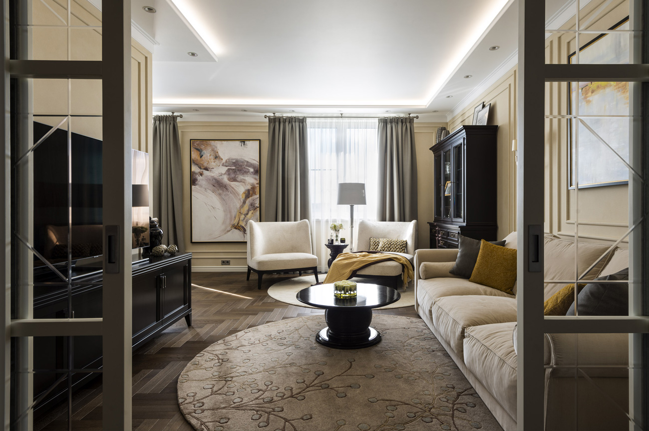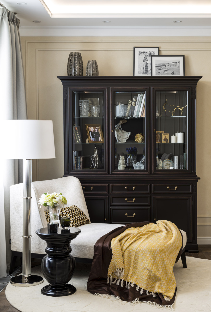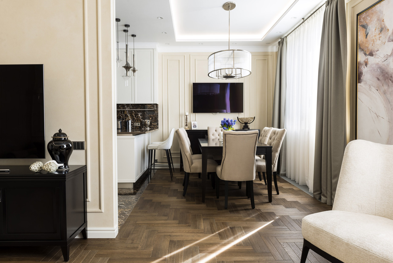 Прямоугольные очертания молдингов на стенах и филенок на дверях шкафов вместе с контрастными сочетаниями придают интерьеру эффект графичности. Бра в зоне гостиной в вечернее время обеспечиваю приглушенный комфортный свет.