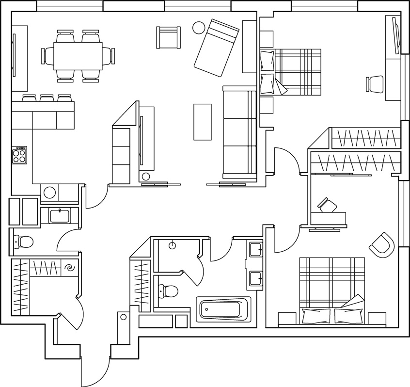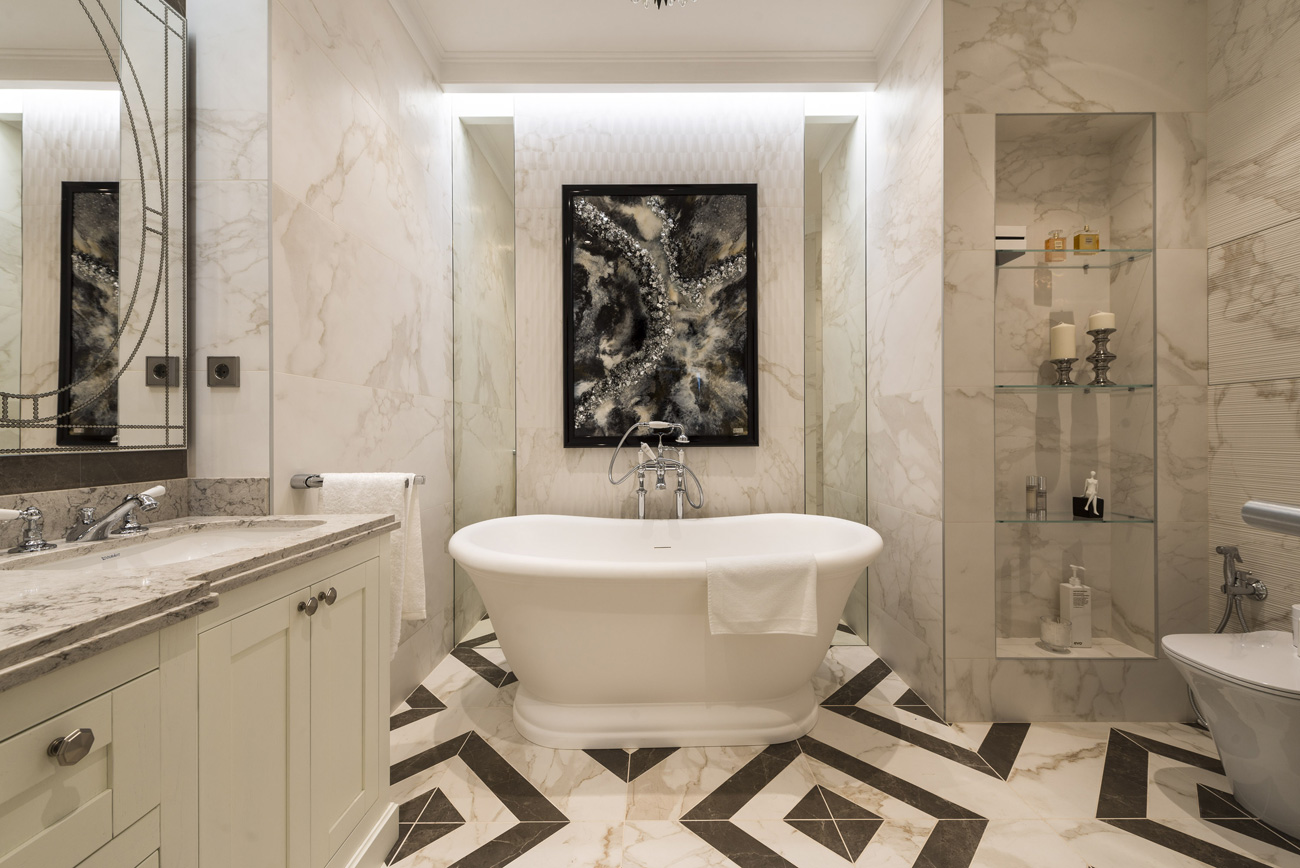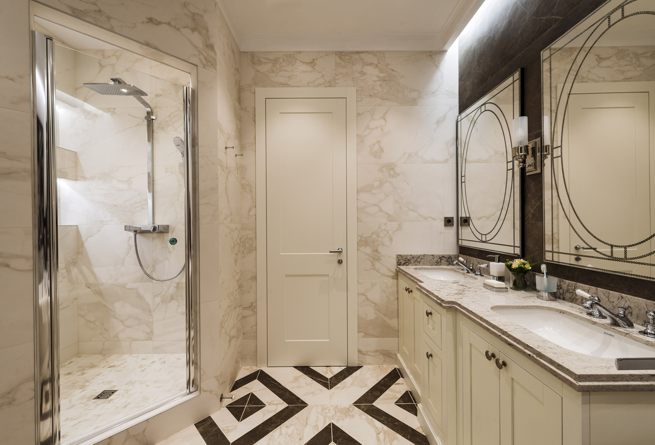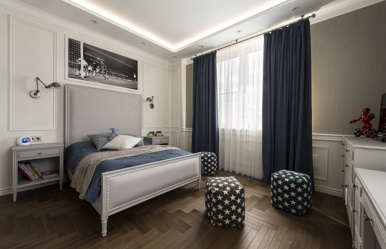 Прямоугольные очертания молдингов на стенах и филенок на дверях шкафов вместе с контрастными сочетаниями придают интерьеру эффект графичности. Бра в зоне гостиной в вечернее время обеспечиваю приглушенный комфортный свет.