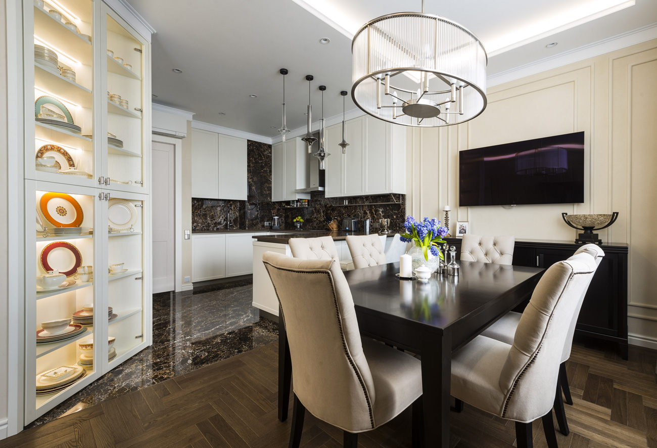 Оформление прихожей и просторного холла парадное. Особенно привлекает внимание шкаф-витрина со встроенной подсветкой. Гостиная, столовая и кухня стилистически организованы как единое пространство. Напольное покрытие — из паркетной доски с эффектным рисунком раскладки. Зонирование создано, в основном, с помощью расстановки мебели.