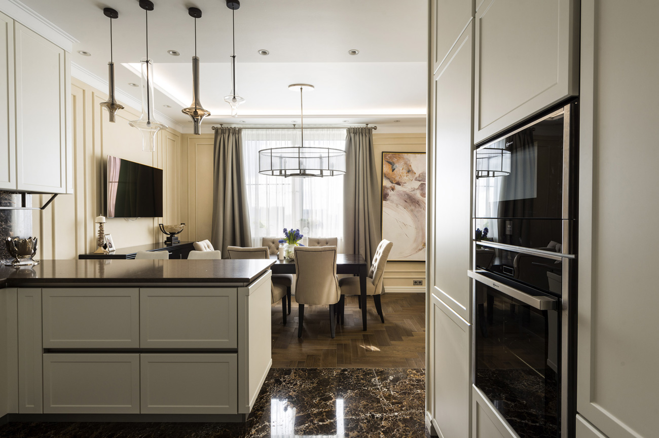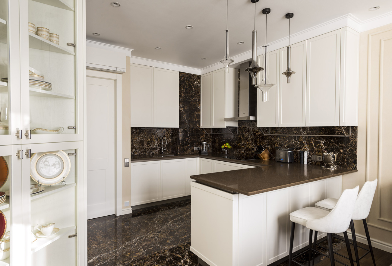 Кухонный гарнитур размещен в нише, что делает процесс приготовления пищи незаметным для отдыхающих в гостиной. Светлые шкафы контрастируют с «фартуком» и напольным покрытием из темного мрамора.