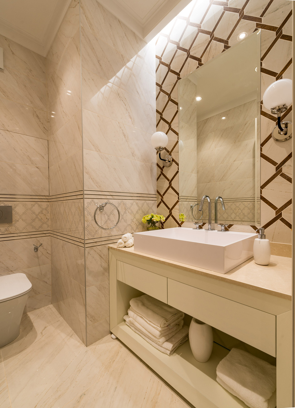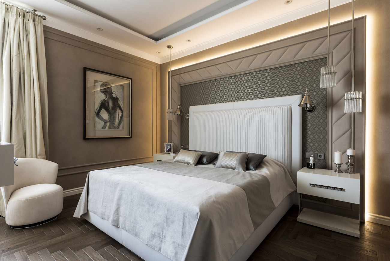 Эффект «уютной» элегантности в интерьере городской квартиры создают благородная колористическая палитра из сложных пастельных тонов и классический декор.