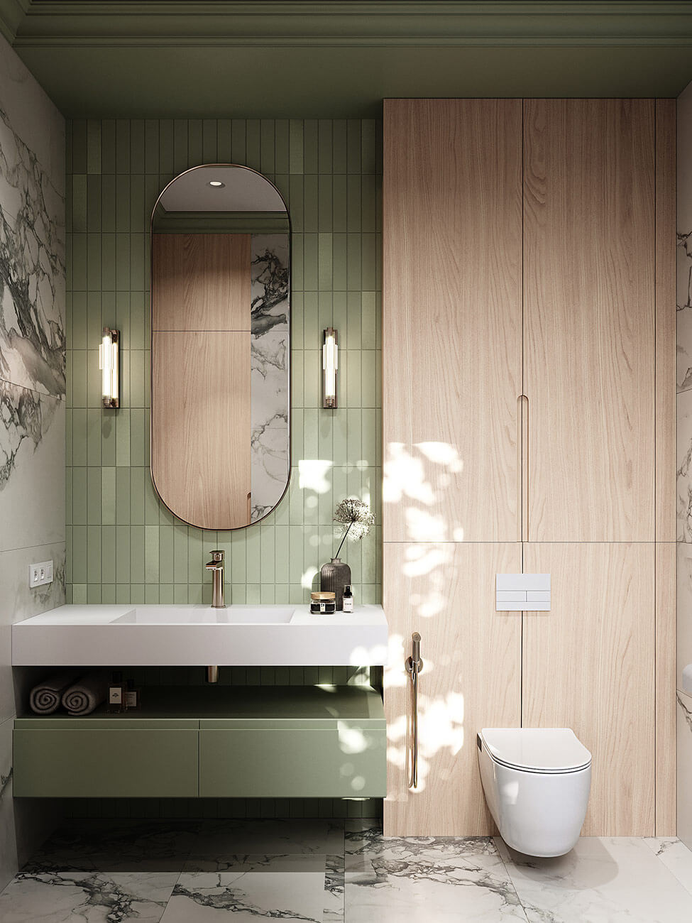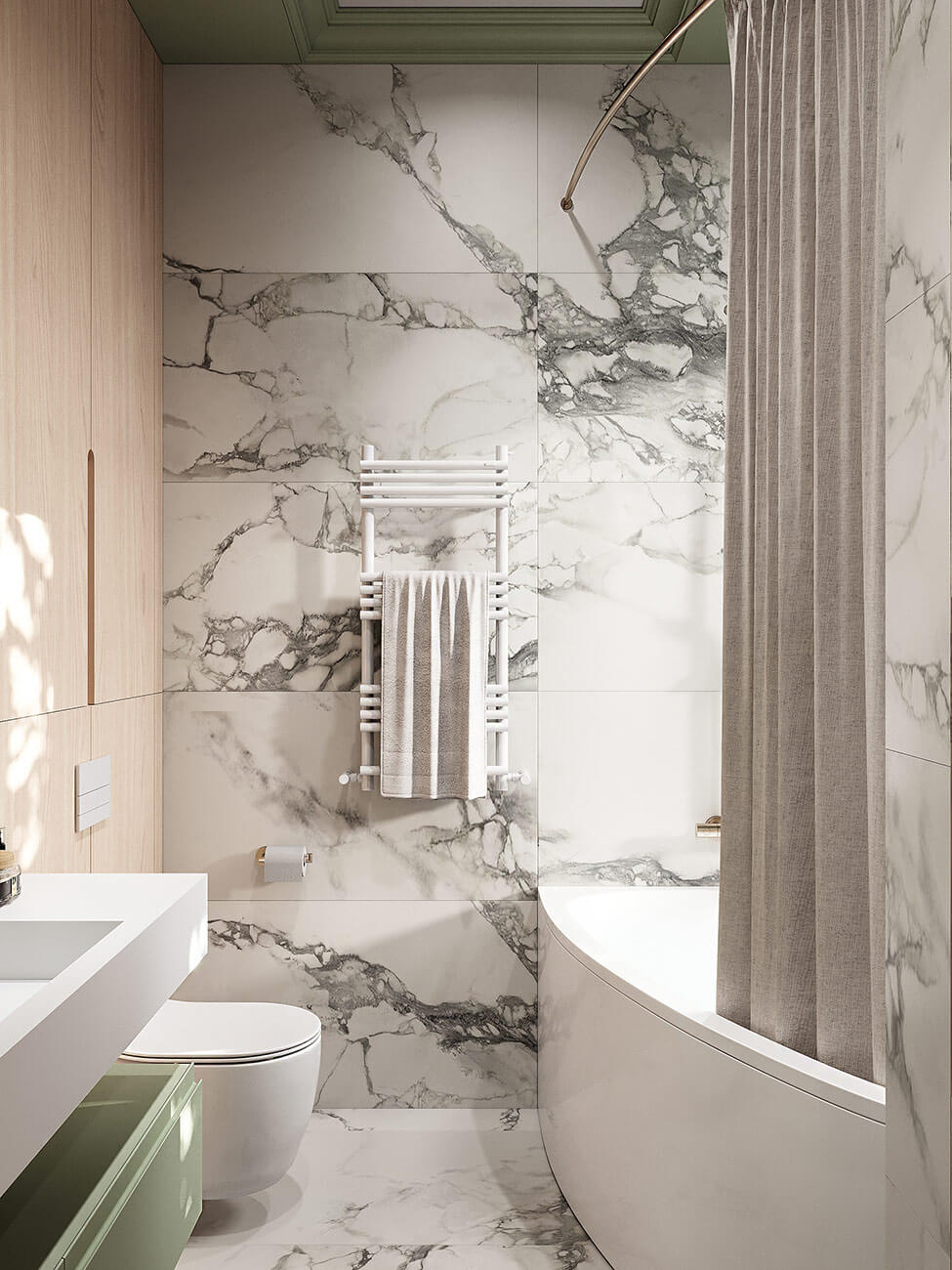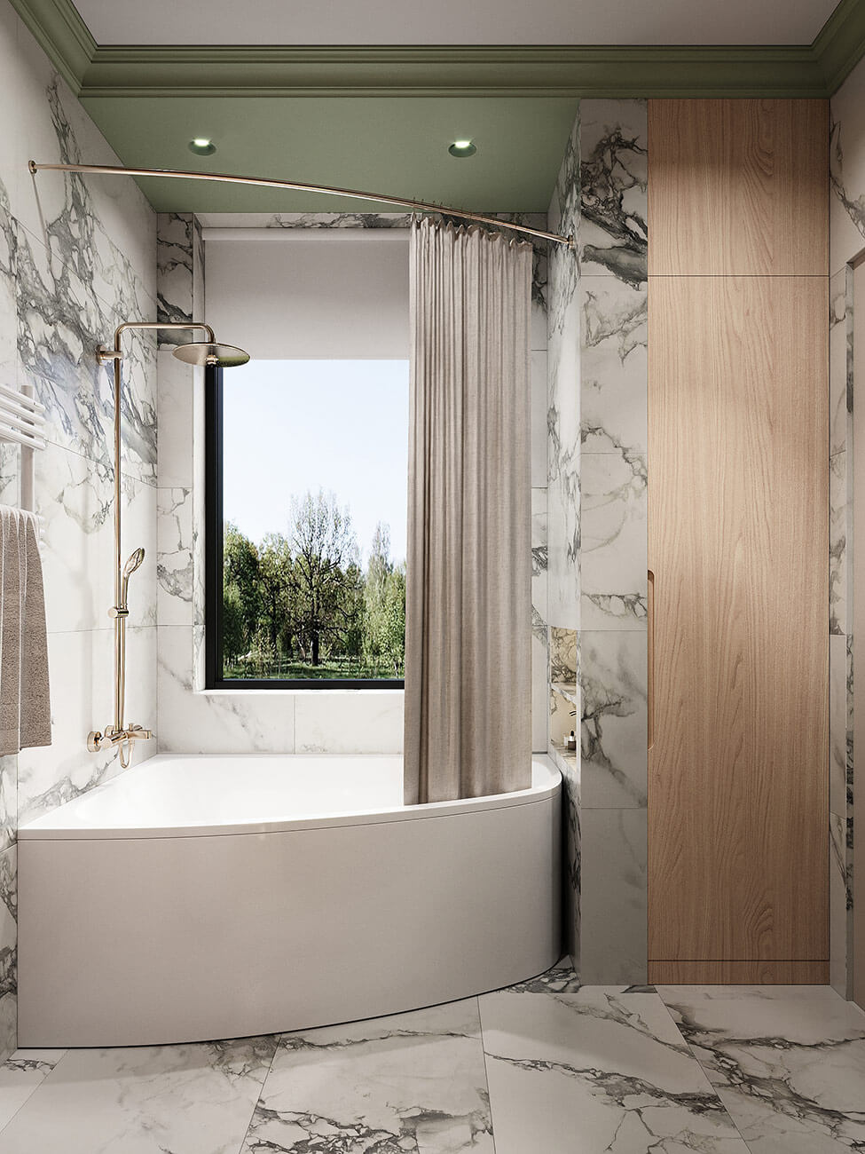 Так как у нас хозяйская спальня – это мастер спальня. Здесь конечно же есть отдельная ванная комната, площадью 6,5 м2. В отделке был выбран синтез из крупноформатного керамогранита под мрамор, как база, и мелкоформатной зеленой плитки, как акцент. Обратите внимание на потолок. Ванную я разделила на три части: мойка - сан.узел – транзит или проход – сама ванна и шкаф для хранения. В зоне мойки и сан.узла, а также ванны и шкафа потолок опущен вниз, и выкрашен в зеленый цвет плитки.