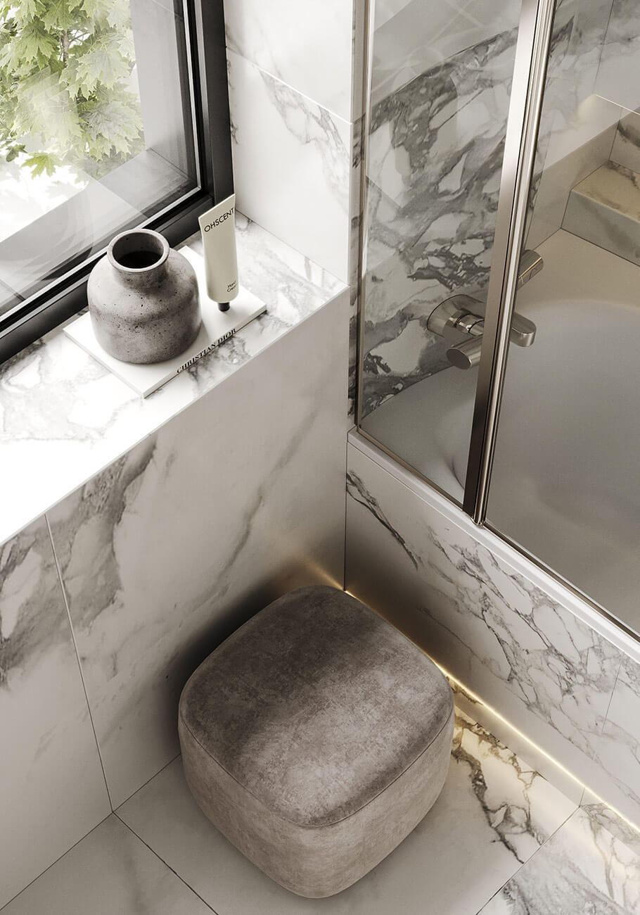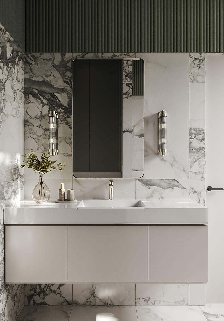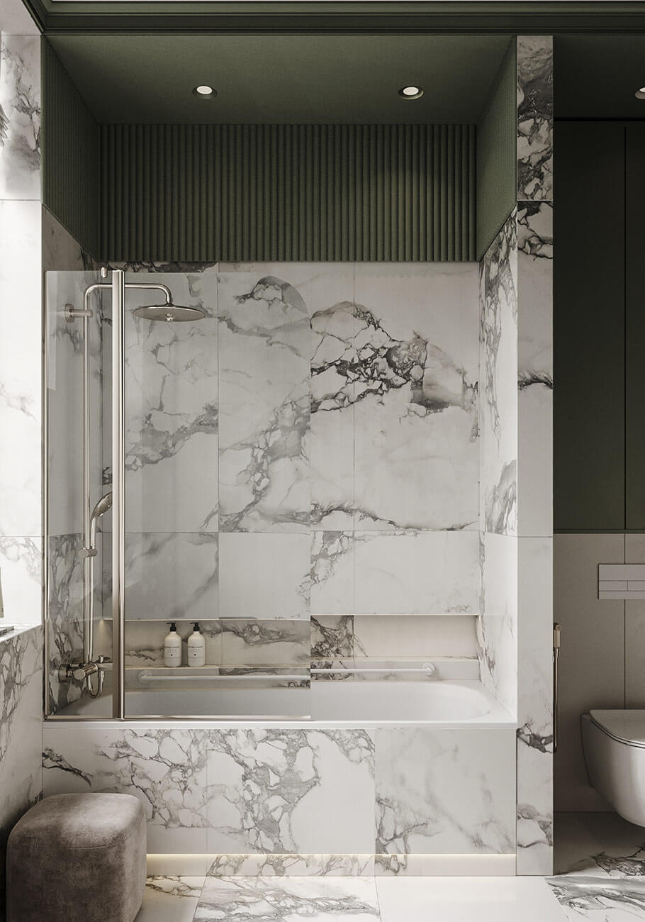 Так как у нас хозяйская спальня – это мастер спальня. Здесь конечно же есть отдельная ванная комната, площадью 6,5 м2. В отделке был выбран синтез из крупноформатного керамогранита под мрамор, как база, и мелкоформатной зеленой плитки, как акцент. Обратите внимание на потолок. Ванную я разделила на три части: мойка - сан.узел – транзит или проход – сама ванна и шкаф для хранения. В зоне мойки и сан.узла, а также ванны и шкафа потолок опущен вниз, и выкрашен в зеленый цвет плитки.