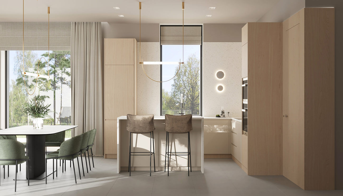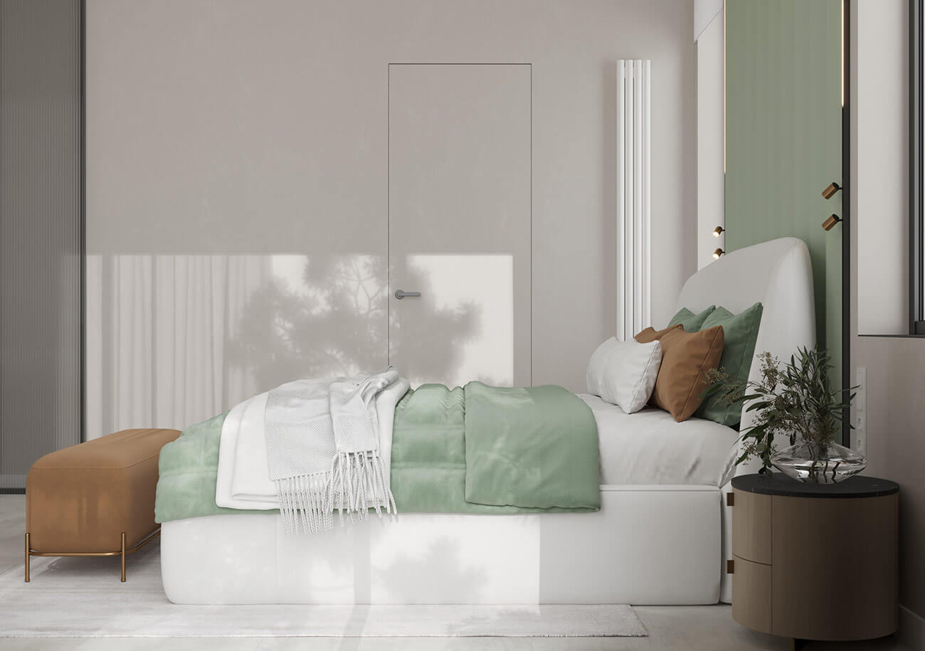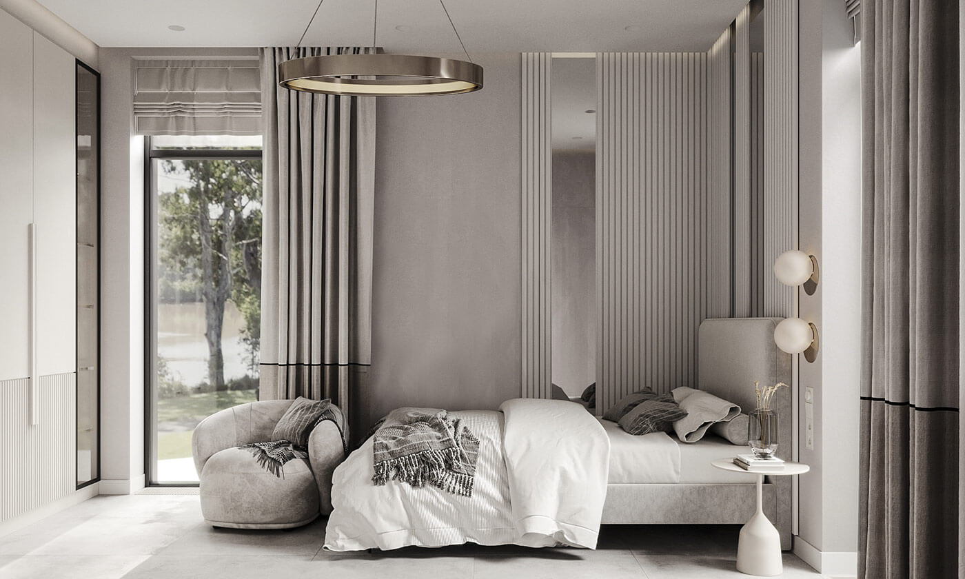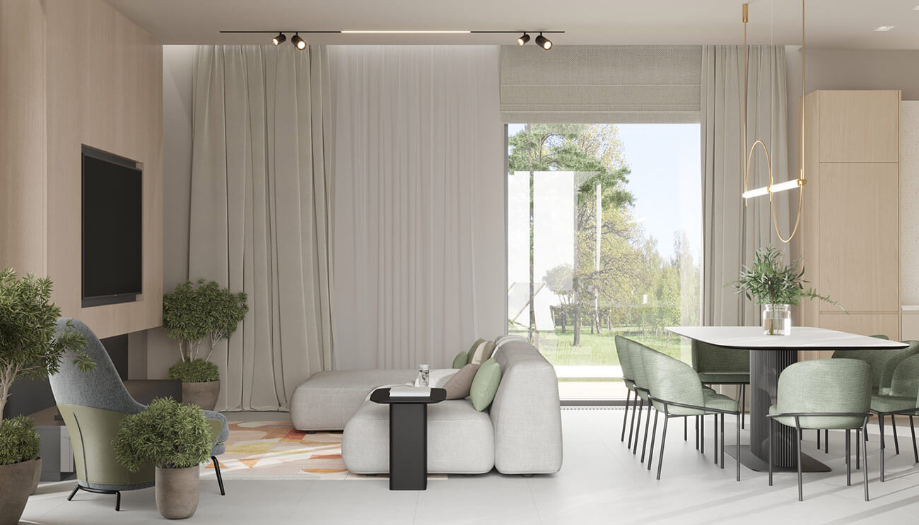 Пожеланием заказчика было создание интерьера в нейтральных оттенках, спокойной гамме, цветовая палитра от бежевого к серому, природные текстуры дерева, мягкий современный минимализм, внедрение элементов классики, также в качестве акцента я использовала в минимальном количестве зеленые оттенки, а для теплоты и элегантности – металлические поверхности из латуни.