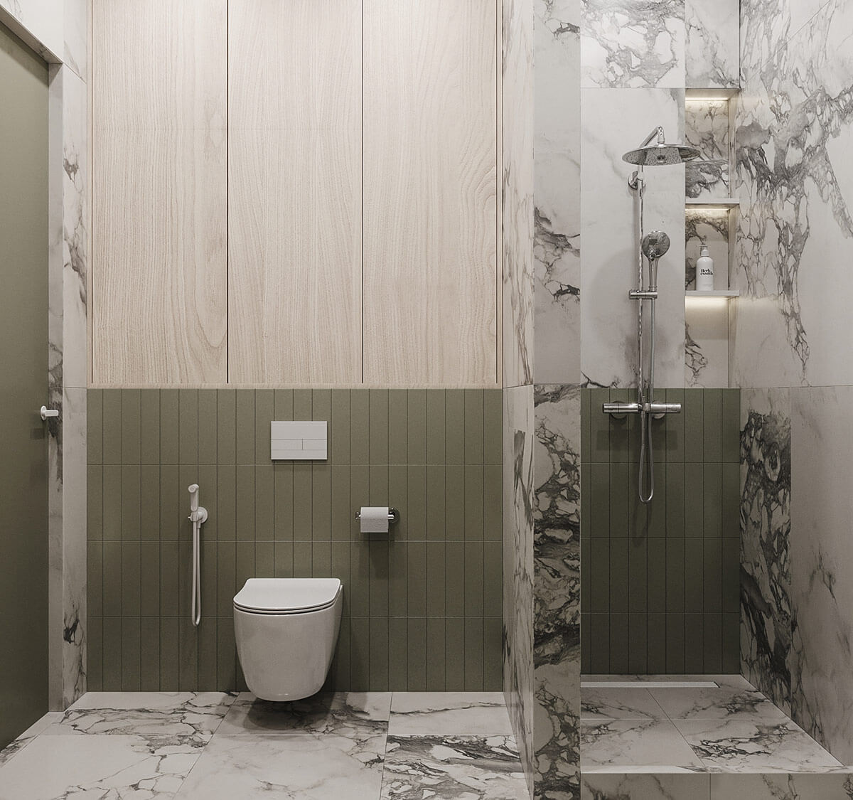 Двигаемся чуть ниже и переходим в гостевой сан.узел, он же душевая. Здесь использована такая же отделка, что и хозяйской ванной – мелкоформатная зеленая плитка, просто более темного оттенка, керамогранит под мрамор и светлое дерево.