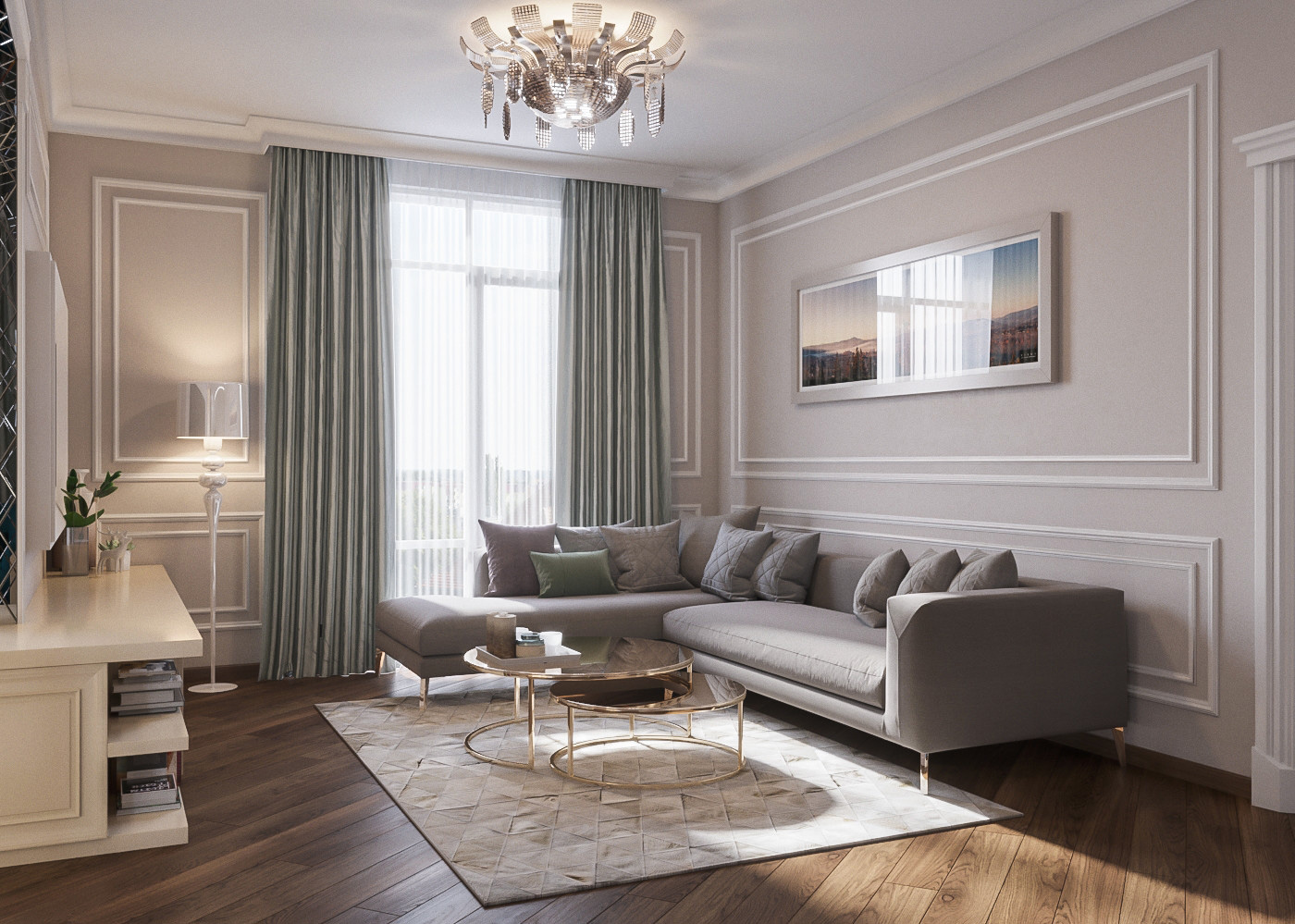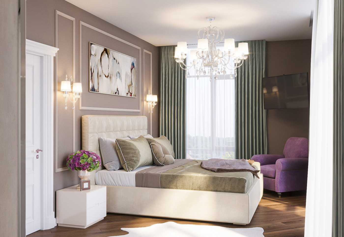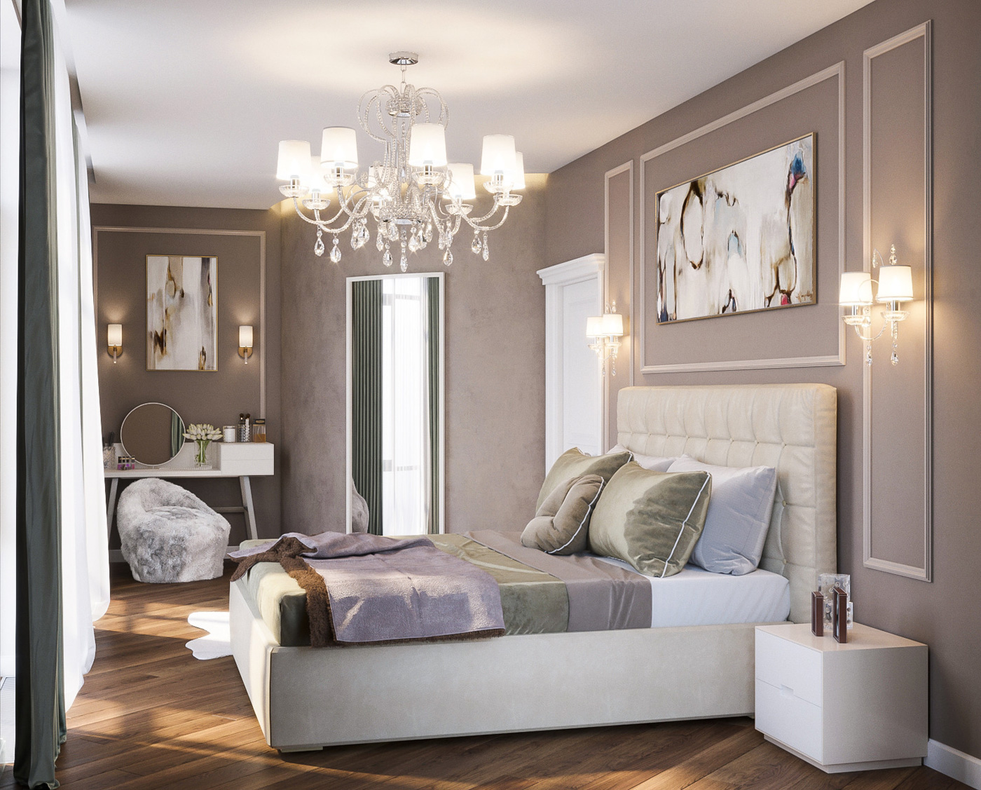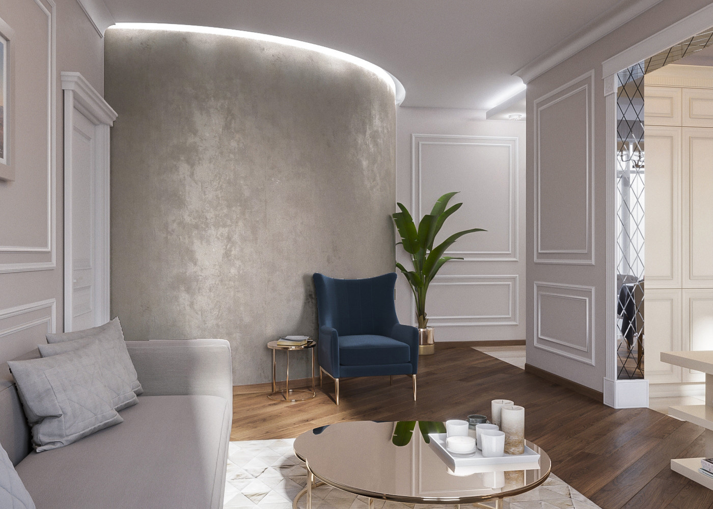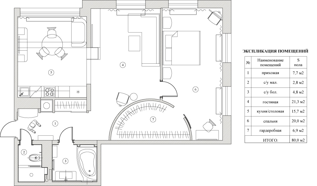 Центром планировочного решения стала полукруглая стена со спрятанной в ней просторной гардеробной комнатой. Все детали обстановки выполнены в неоклассическом стиле и хорошо сочетаются с современным мебельным гарнитуром.