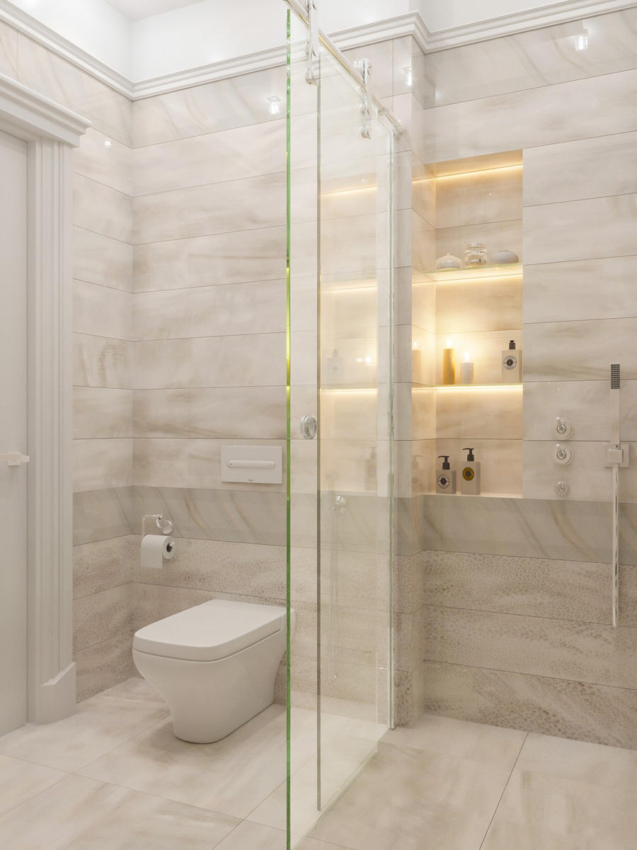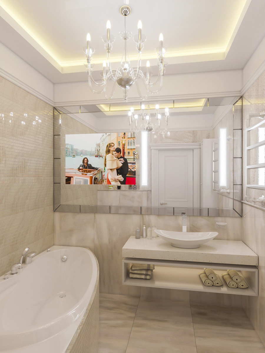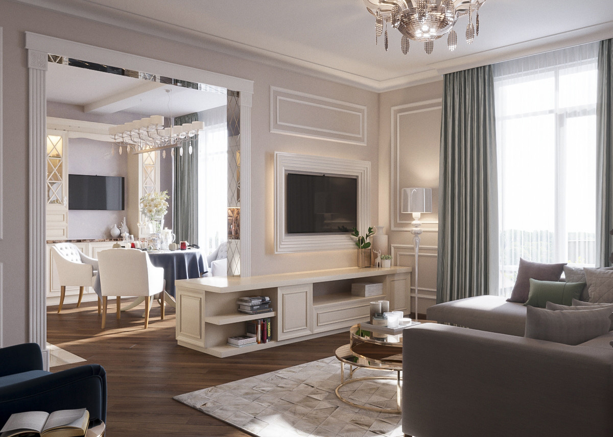 Кухня выдержана в светлых оттенках, контрастирующих с каменной столешницей. Особое внимание следует обратить на отделку зеркальными панелями проема, соединяющего гостиную с кухней, — такое декоративное решение сделало границу между двумя разными помещениями невидимой.