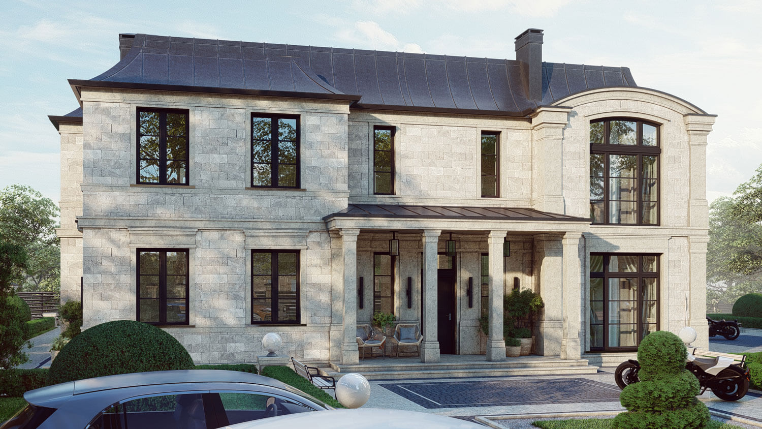 Принципы классических архитектурных объемно-пространственных решений нашли применение в создании многоступенчатых фасадов зданий, использовании двухсветных атриумов с парадными лестницами, в выступах эркеров и т. д. Однако сложность задачи и инновационность проектных планировочных решений заключается в том, что копирование традиционных классических планировок с анфиладами помещений не отвечает современным требованиям к комфортному жилью — размещение и состав помещений скорректированы с учетом индивидуальных пожеланий заказчика и учитывают максимально удобные сценарии их использования.