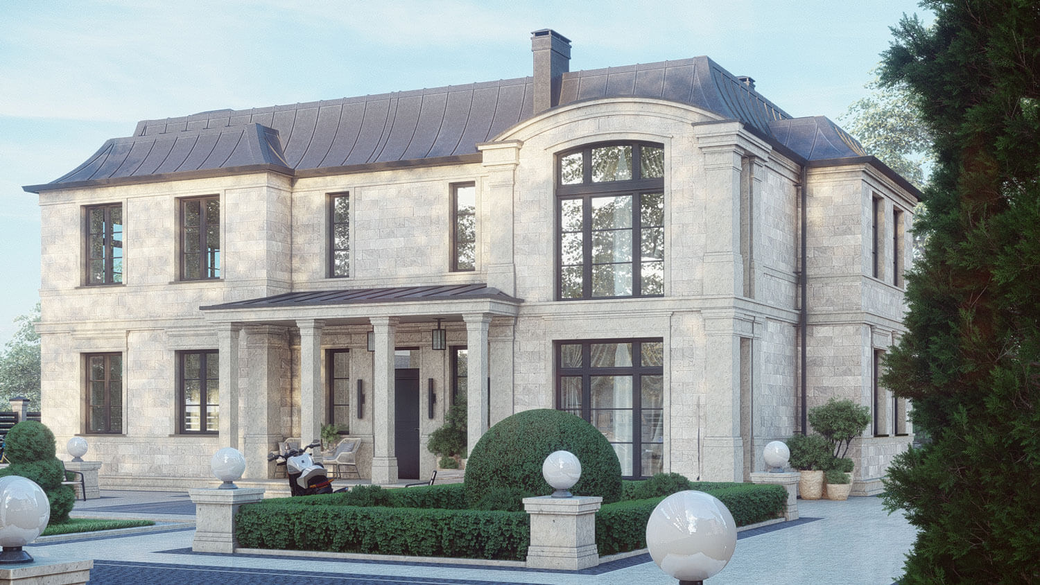 Дома в этом усадебном комплексе объединяются общей территорией, благоустроенной в традиционных формах и материалах: линейные посадки хвойных растений, столбы и цоколь ограждений — натуральный известняк светлого, серо-бежевого, цвета, заполнение секций - декоративные черные металлические решетки, деревянная доска натурального цвета.