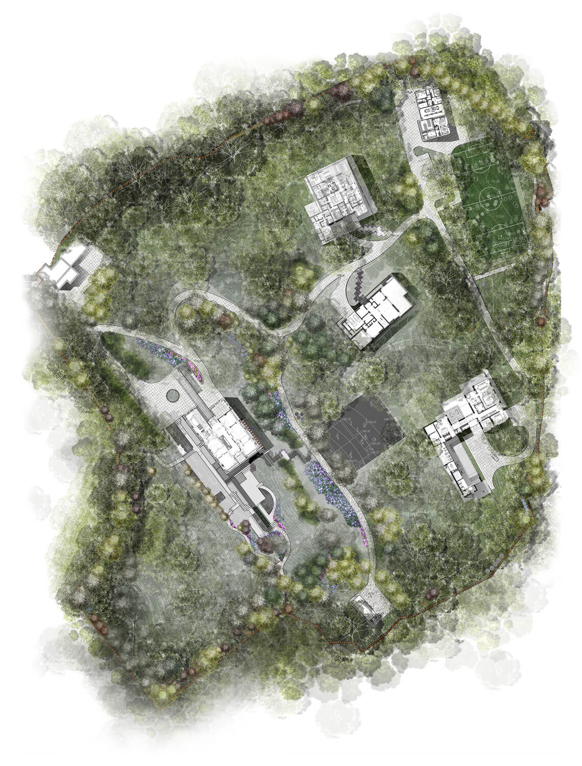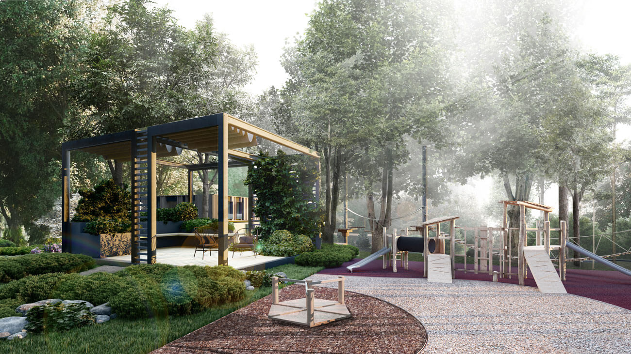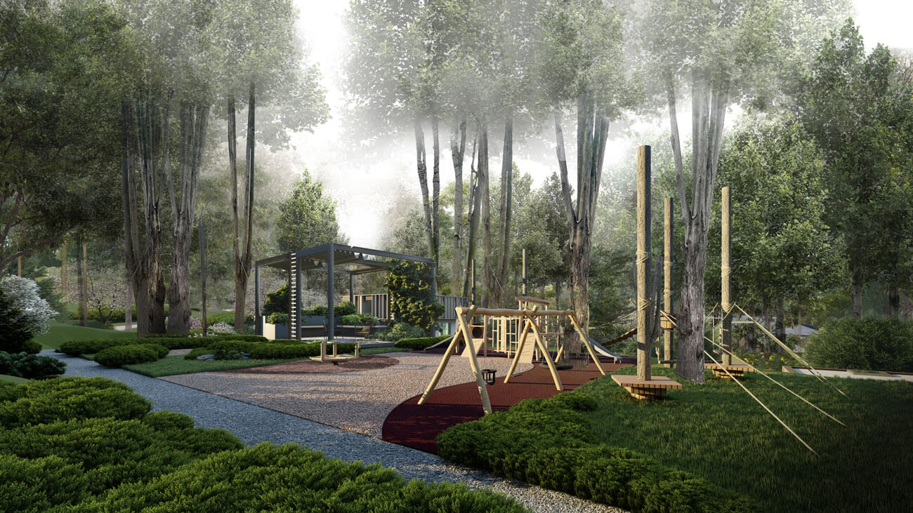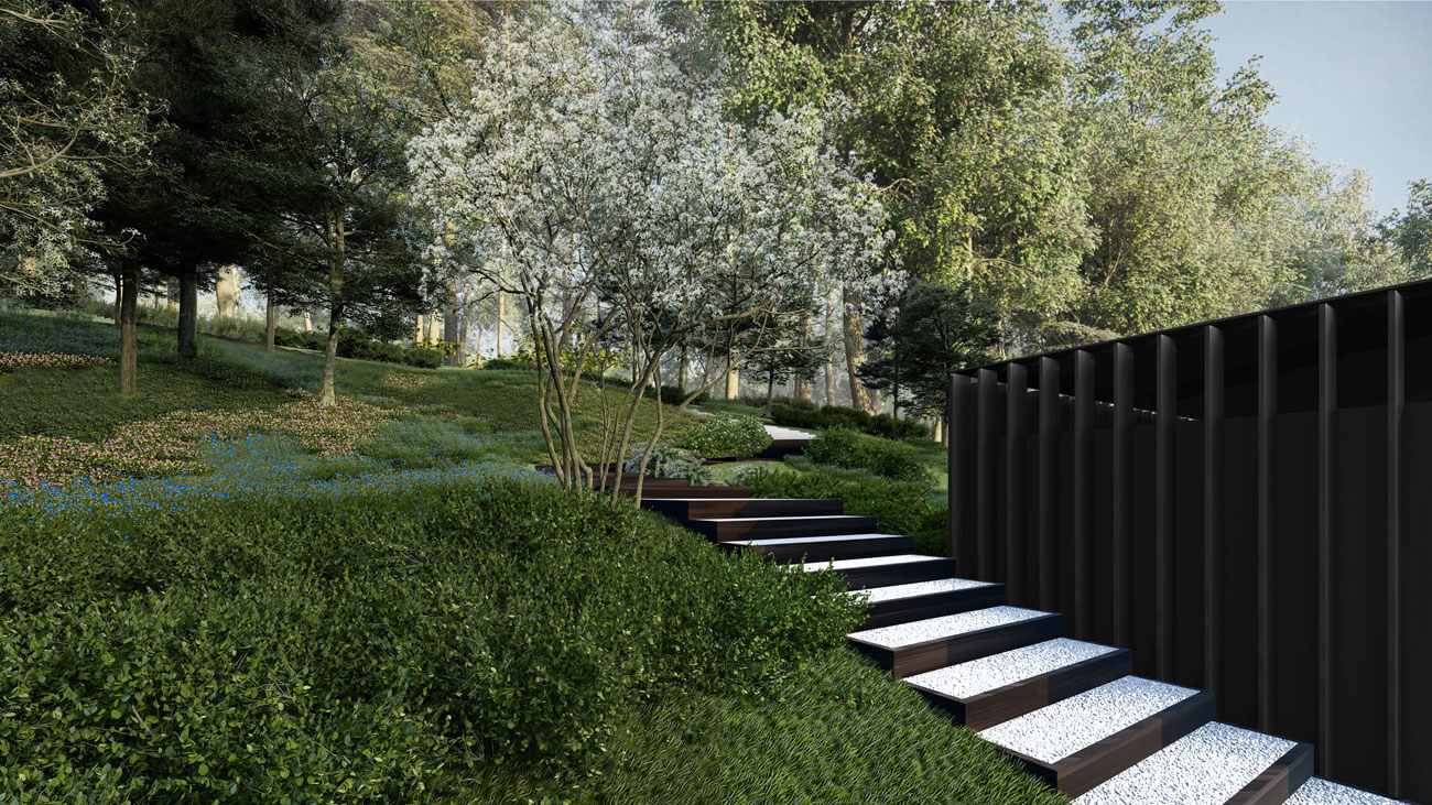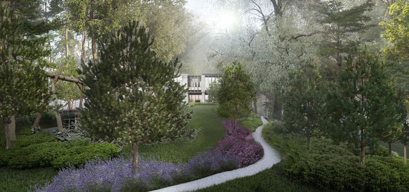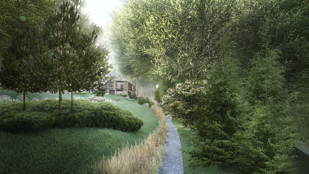 Территория площадью 5 га представляет собой лесопарковую местность с уже существующими вековыми деревьями преимущественно лиственных пород и ярко выраженным рельефом с перепадом высот. Мы постарались сохранить особенность местности и сформировали основные принципы концепции: