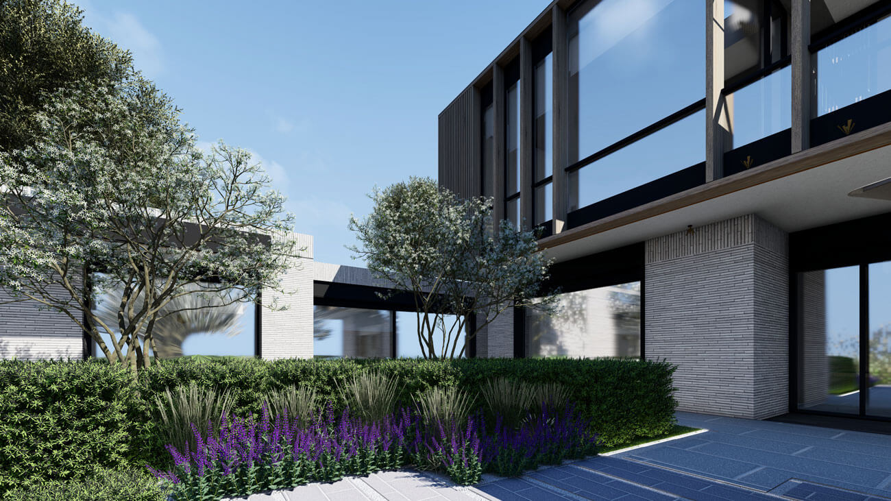 Зона центрального въезда является одной из акцентных, задающих настроение всему проекту. Главная роль здесь отведена акцентному дереву, которое является своего рода арт-объектом.