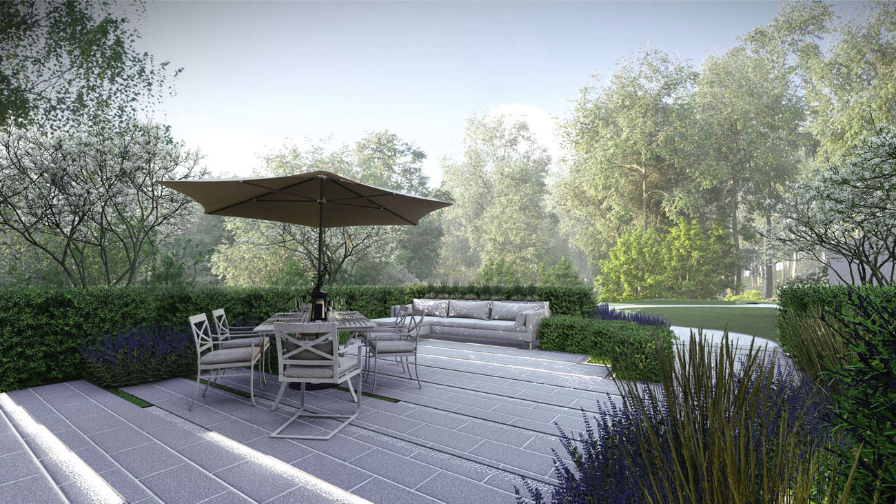 Нам удалось спланировать рельеф территории практически незаметно и выстроить дорожно-тропиночную сеть с оптимальным для движения уклоном. Для этого используется террасирование и несколько подпорных стен в тех местах, где это необходимо. Дополняют естественный ландшафт территории лестницы из деревянного бруса и гранитного отсева.
