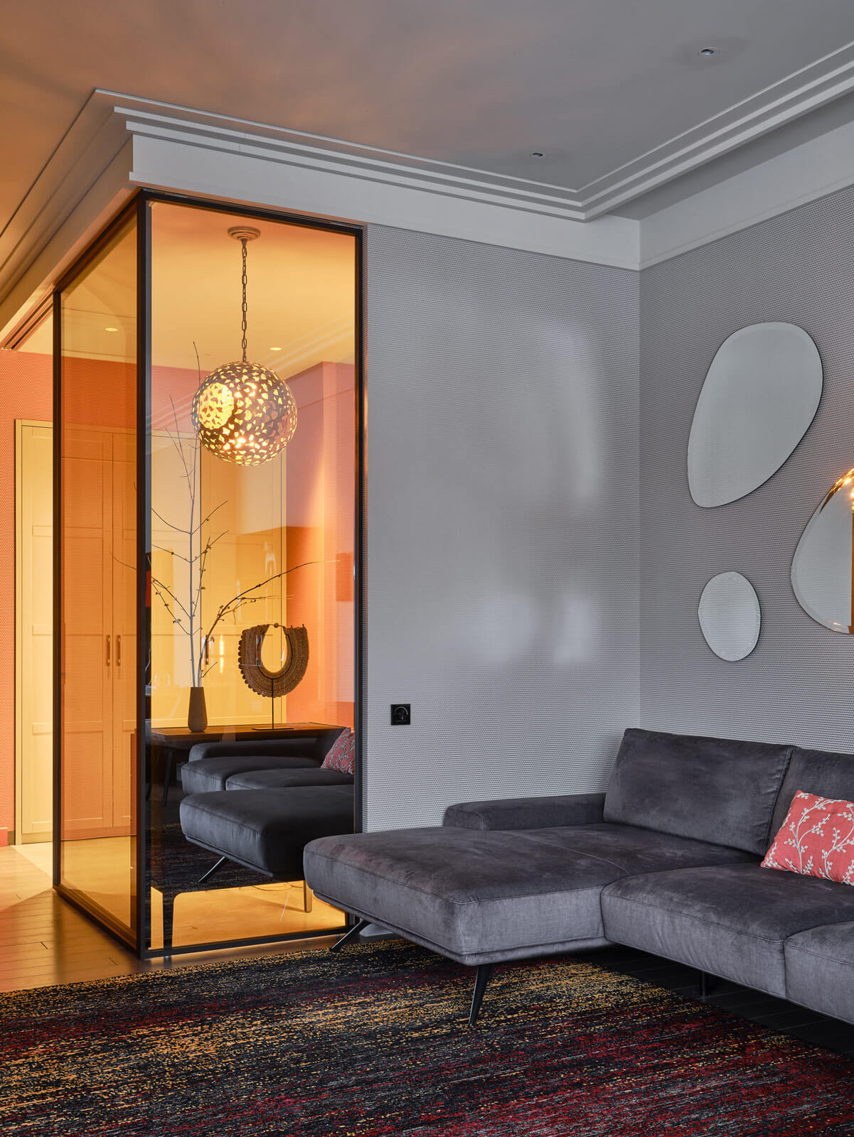 Часть вспомогательных помещений оставались без естественного дневного освещения, поэтому мастер-спальня объединена с ванной комнатой и проходной гардеробной, а в прихожей предусмотрены стены из тонированного стекла с теплым бронзовым оттенком. Так эти объемы стали полностью проницаемыми для естественного света.