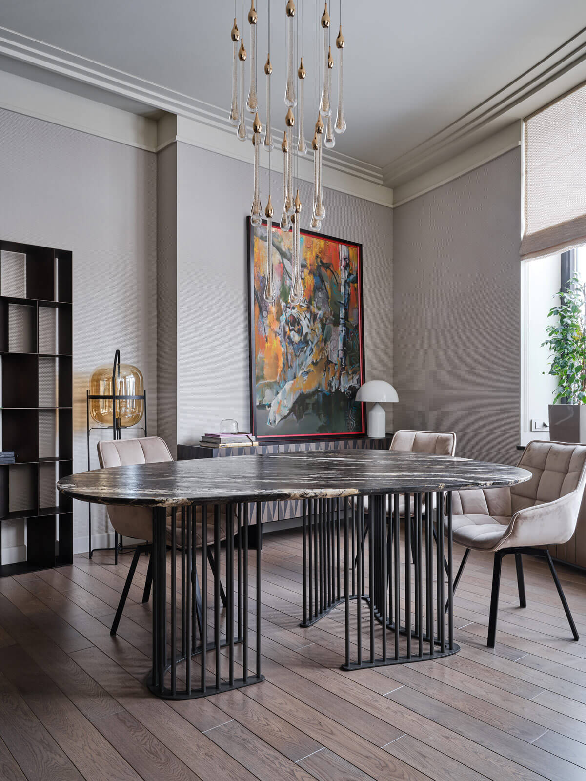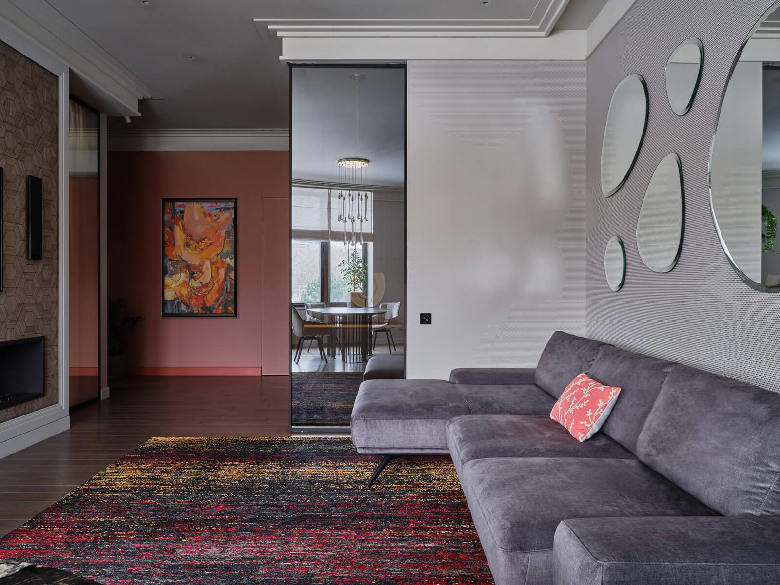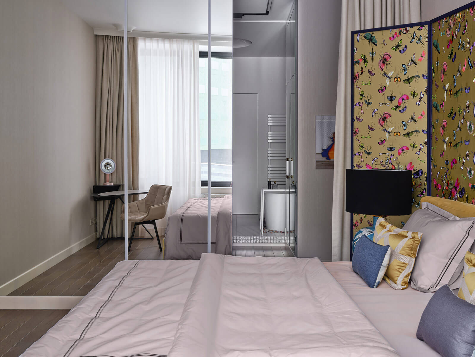 Едва ли не главную роль в интерьере играют цвета: открытые, насыщенные. И акцентные детали: украшение спальни — ушастая ширма в изголовье кровати с мотивами вечного лета и бабочками на золотом фоне, в парадных зонах на первый план выходит сочная и экспрессивная живопись художника Ивана Федотова. Рука об руку с цветотерапией идет световой дизайн. В квартире можно создавать разные световые сценарии, легко меняя настроение квартиры.