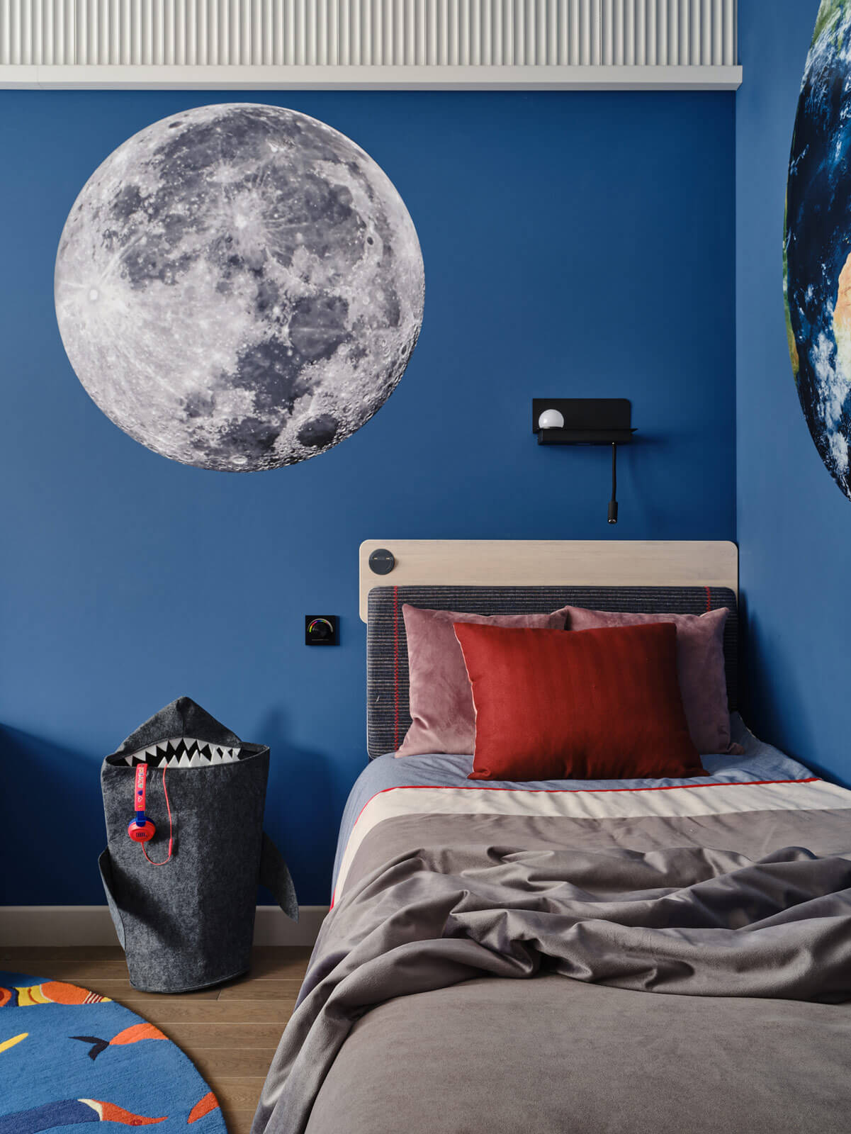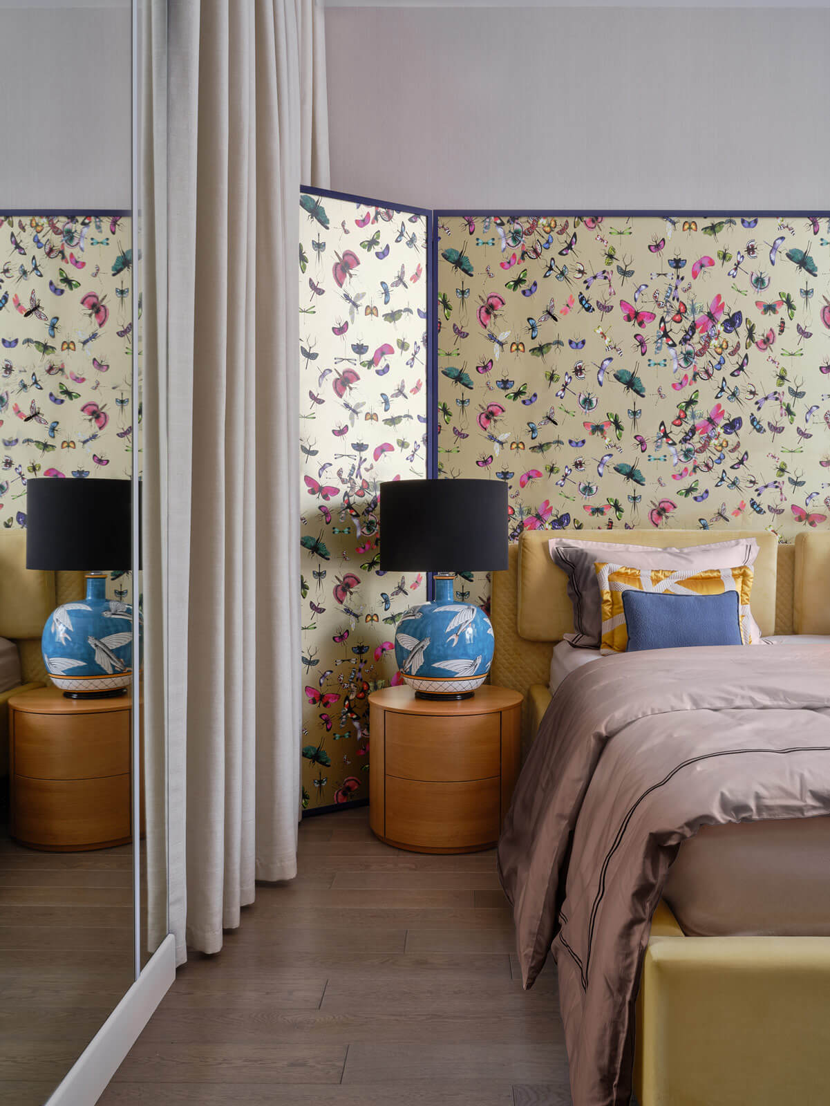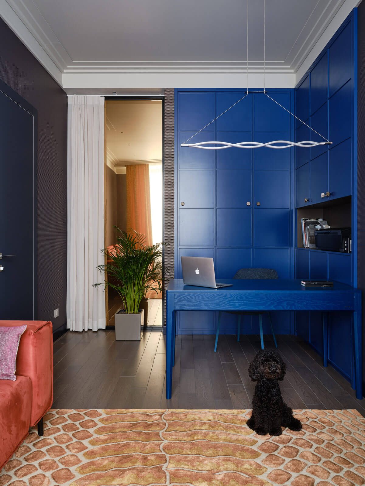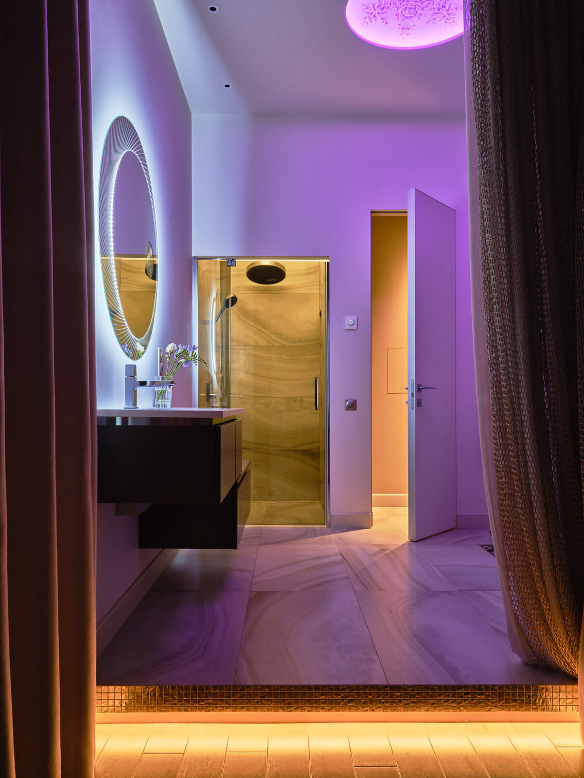 Едва ли не главную роль в интерьере играют цвета: открытые, насыщенные. И акцентные детали: украшение спальни — ушастая ширма в изголовье кровати с мотивами вечного лета и бабочками на золотом фоне, в парадных зонах на первый план выходит сочная и экспрессивная живопись художника Ивана Федотова. Рука об руку с цветотерапией идет световой дизайн. В квартире можно создавать разные световые сценарии, легко меняя настроение квартиры.