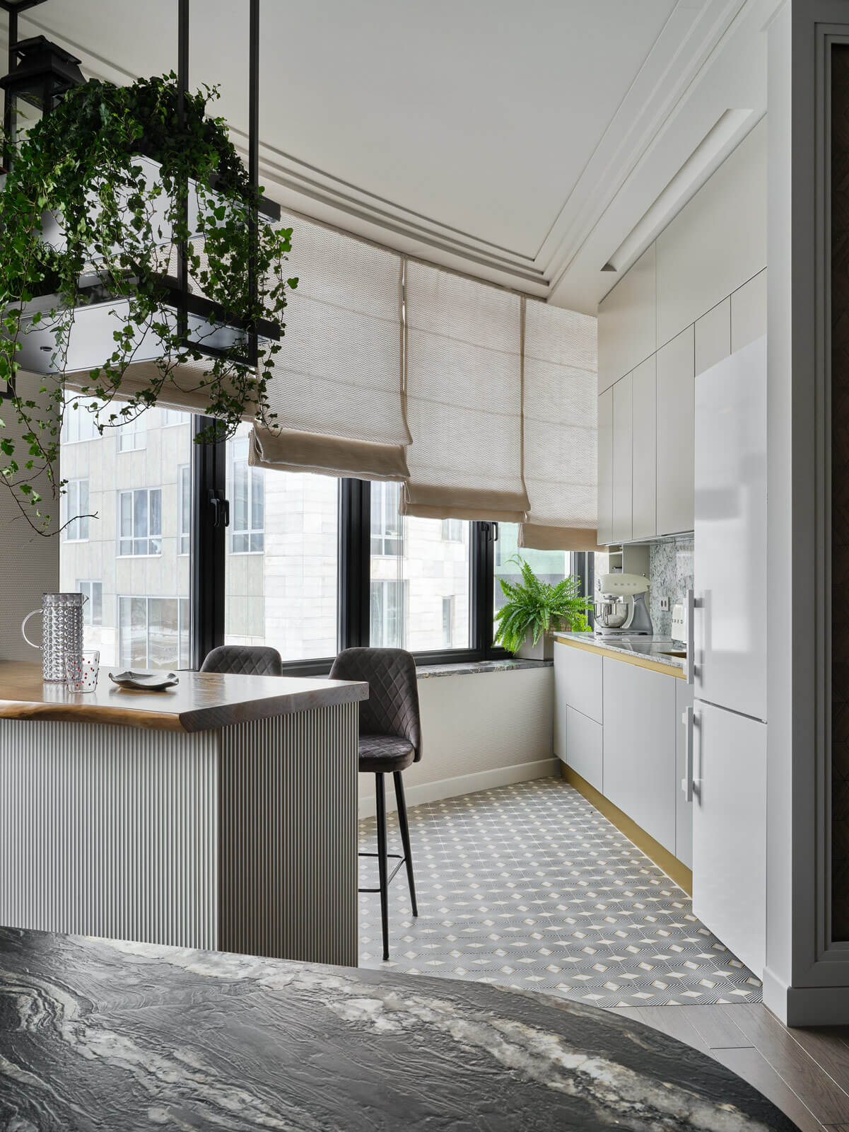 Отдельным вызовом была форма гостиной. Комната имеет скругленную стену, формирующую острый угол, — такую сложную форму было решено обыграть при помощи эффективного зонирования совмещенной с гостиной кухни. Гарнитур с рабочей поверхностью был помещен в самой острой части треугольника, а небольшую барную стойку с подвесными стеллажами над ней установили по диагонали и тем самым очертили пространство кухни, компенсировав неприятные визуальные эффекты сложной геометрии.