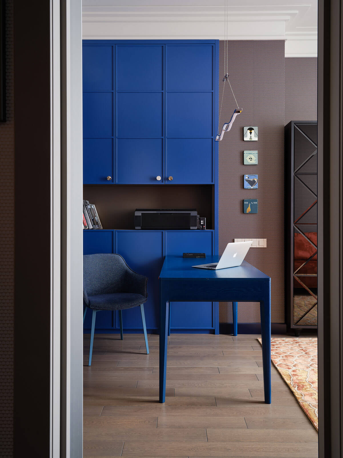 Вслед за общими зонами идет кабинет — главное помещение в квартире творческого человека. Большой, просторный, обособленный от гостиной стеклянным витражом, он продуман до мелочей. Стилистически интерьер получился эклектичным и очень многослойным.