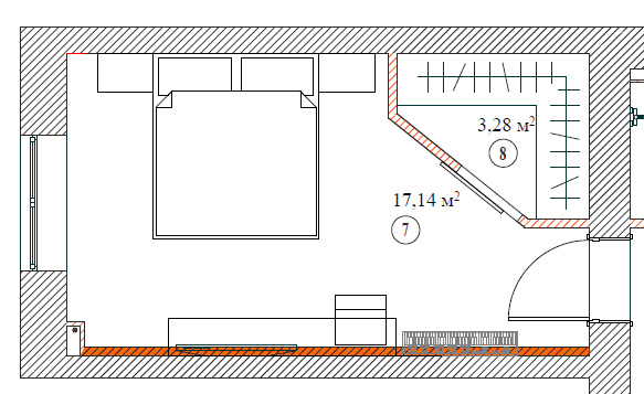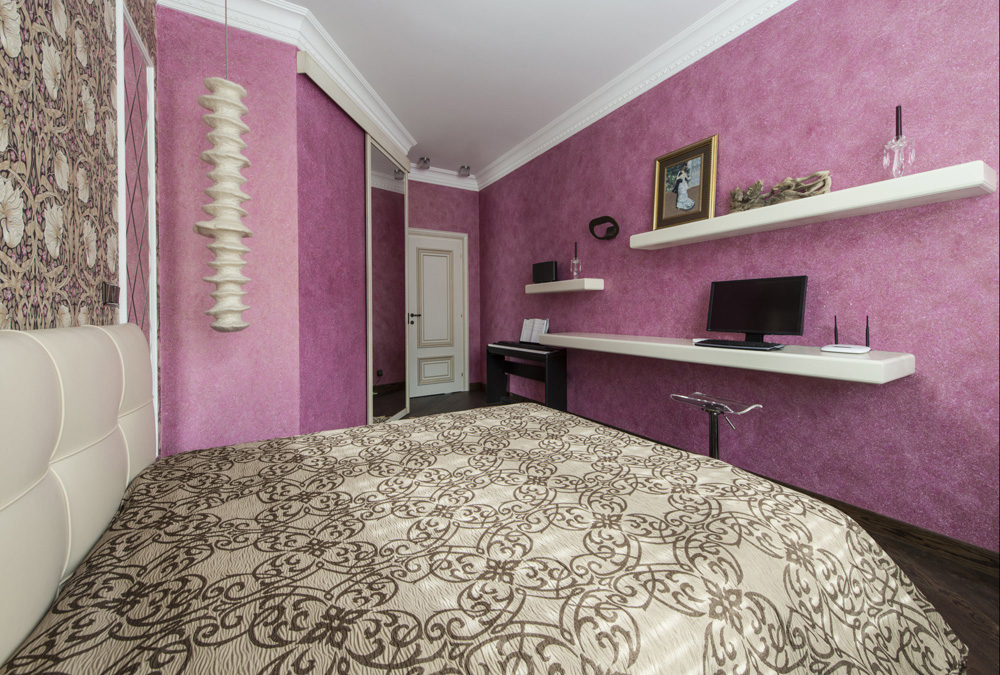 Колорит спальни определяет палитра оформления — сочетание розовато-лиловой декоративной штукатурки и бежево-коричневых покрывала, ковра и обоев с золотистыми и серебристыми вкраплениями, а также белый цвет, в котором решены мебель и светильники у изголовья.