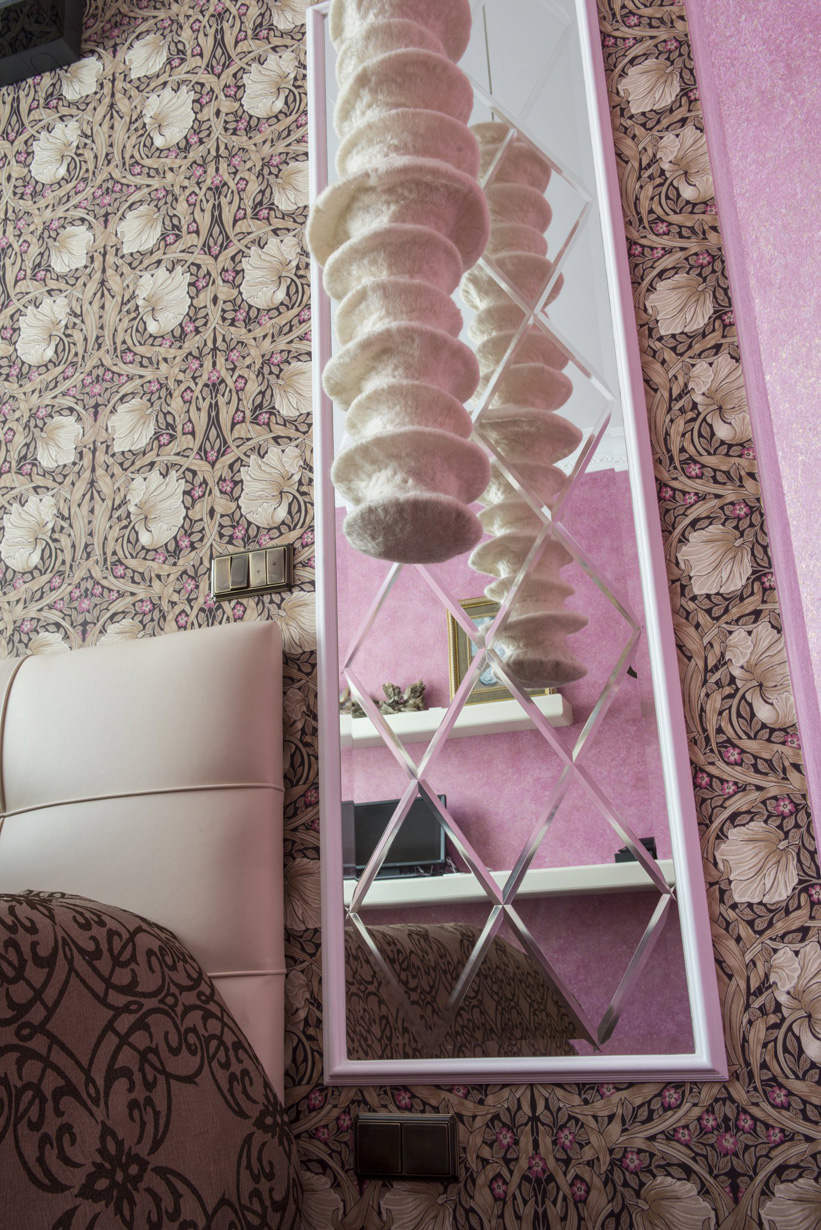 В спальне английские обои с узорами в стиле ар нуво оригинально сочетаются с цветной декоративной штукатуркой. По обе стороны от изголовья кровати расположены узкие панно из фацетированных зеркал, заключенных в профилированные рамы, благодаря чему пространство визуально удваивается. Прикроватные подвесные светильники с ткаными плафонами интригуют своим экзотическим обликом и отражаются в зеркалах.